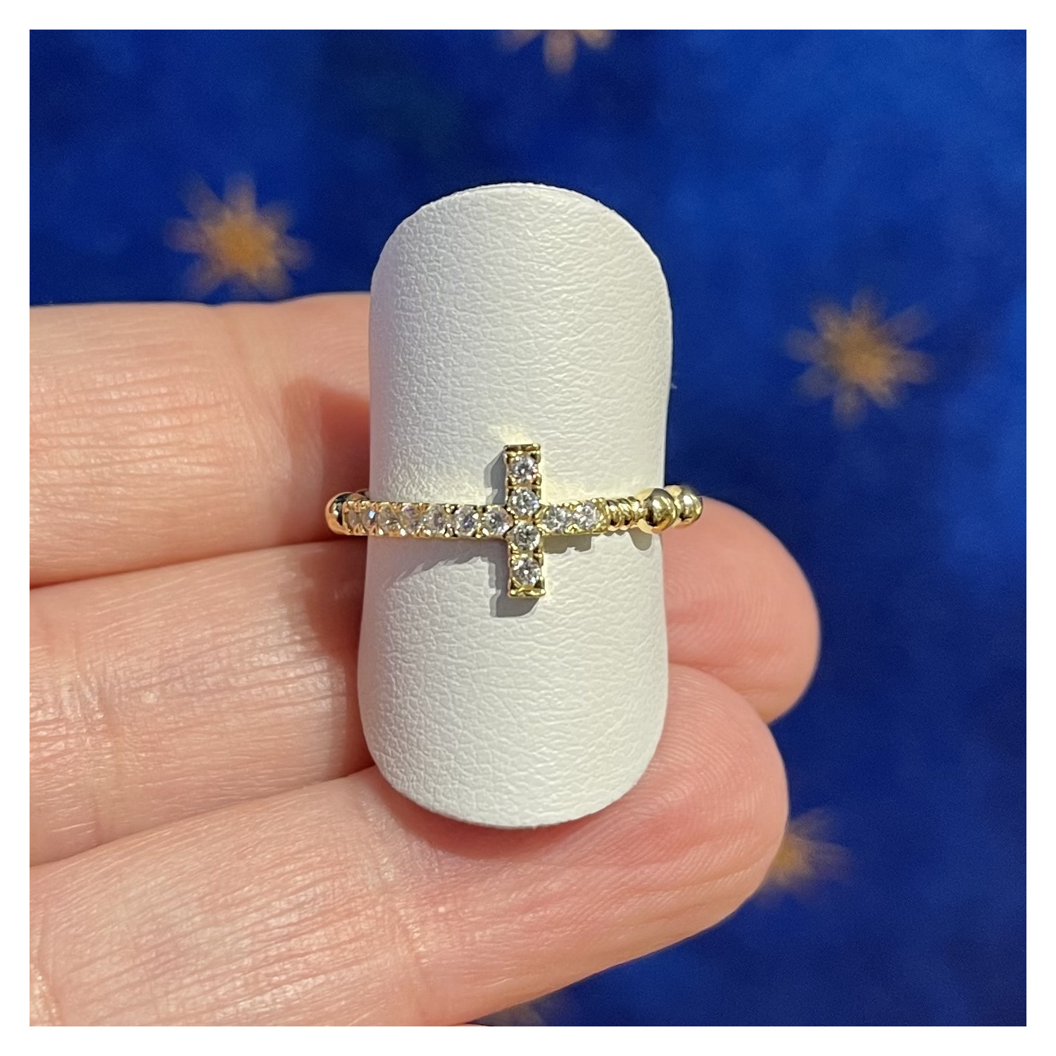 Anello rosario in argento 925 dorato con croce con zirconi incassati.