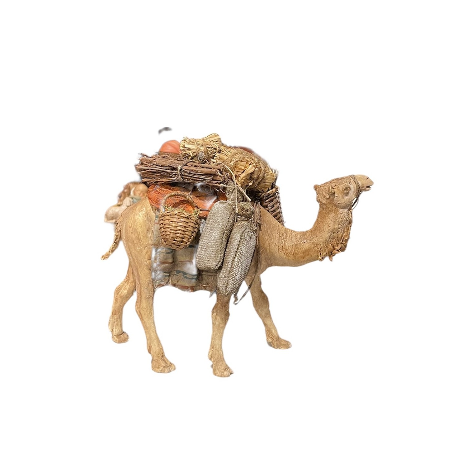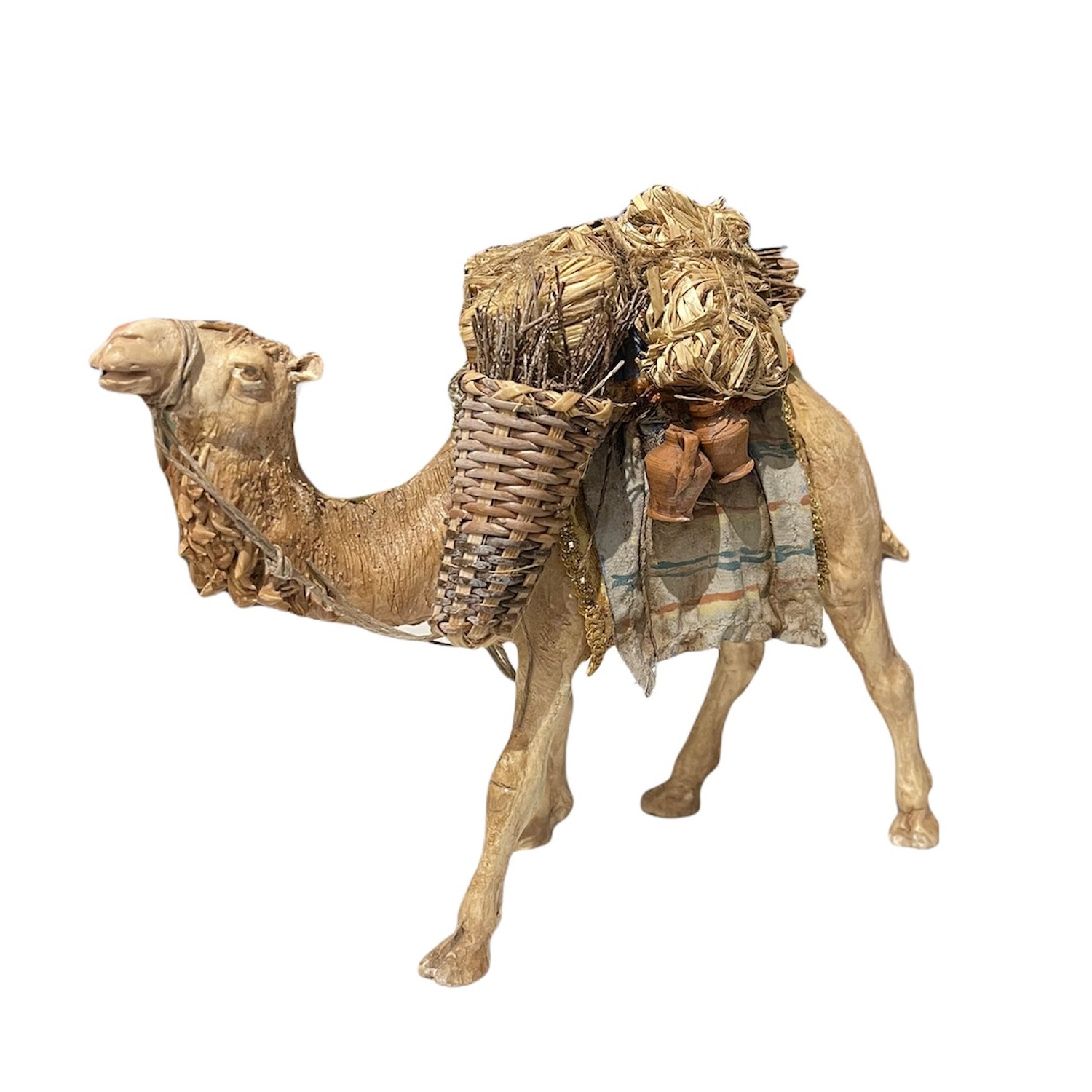 cammello bardato in terracotta vestita con abiti in tessuto completamente fatto a mano. Opera della straordinaria arte di Angela Tripi artista palermitana celebre per i suoi meravigliosi presepi, vere e proprie opere darte conosciute in tutto il mondo.