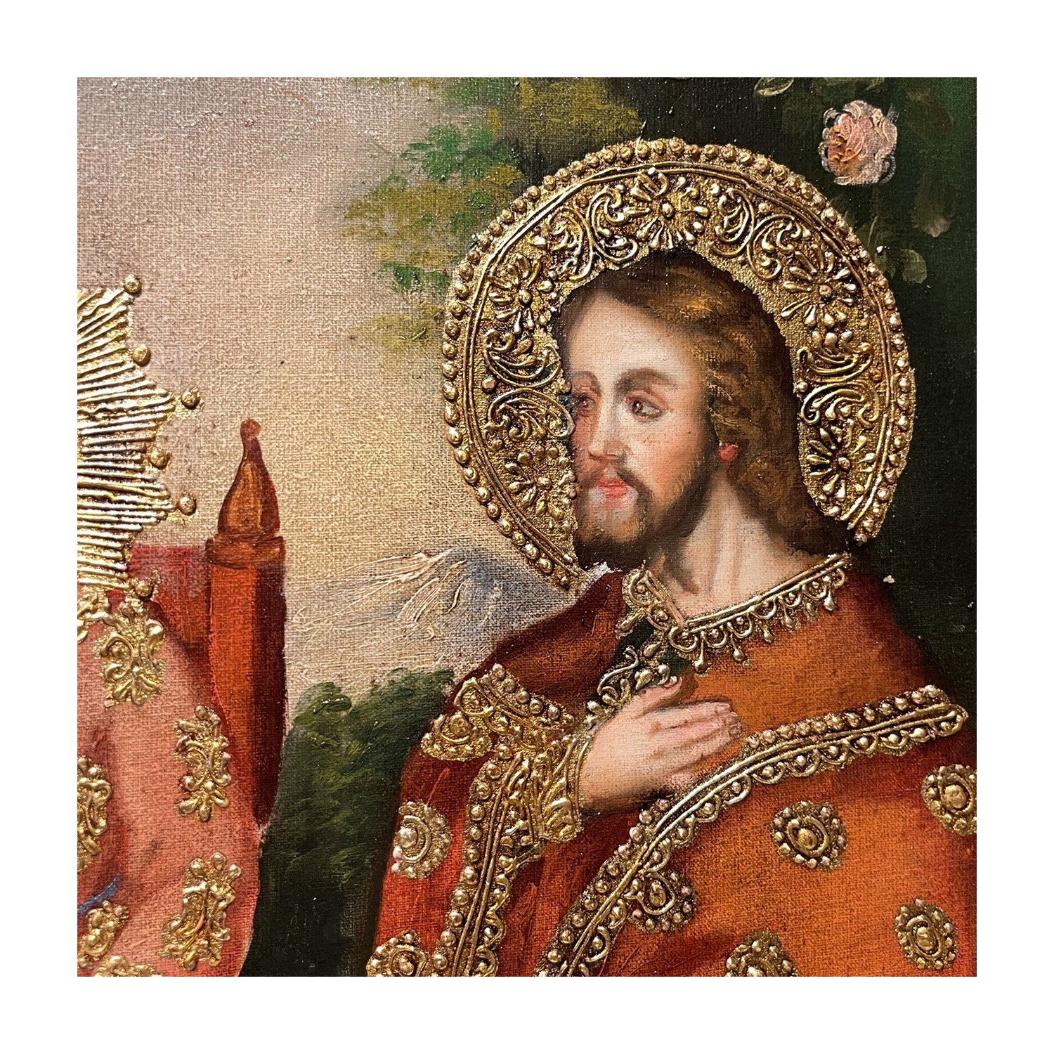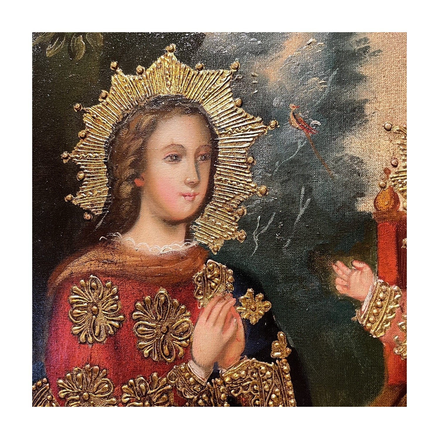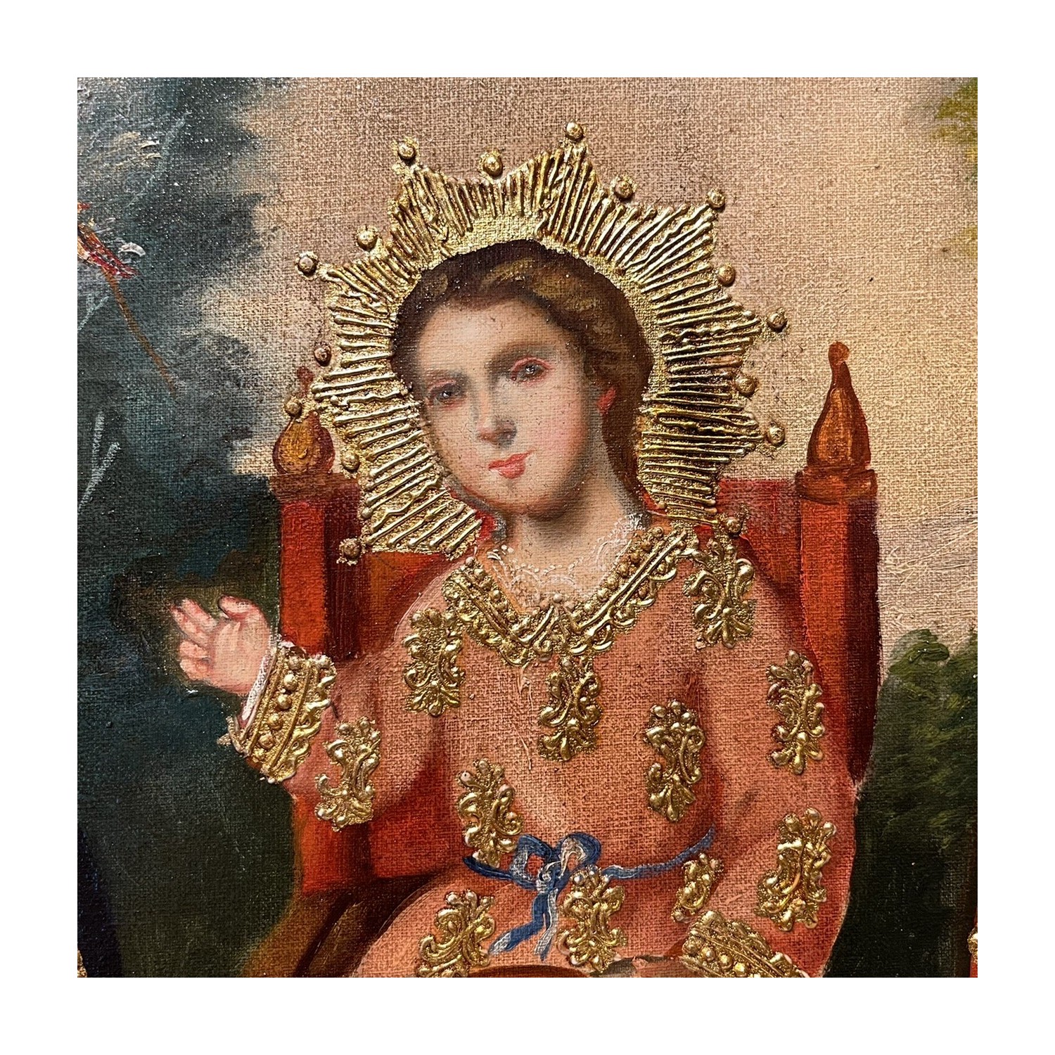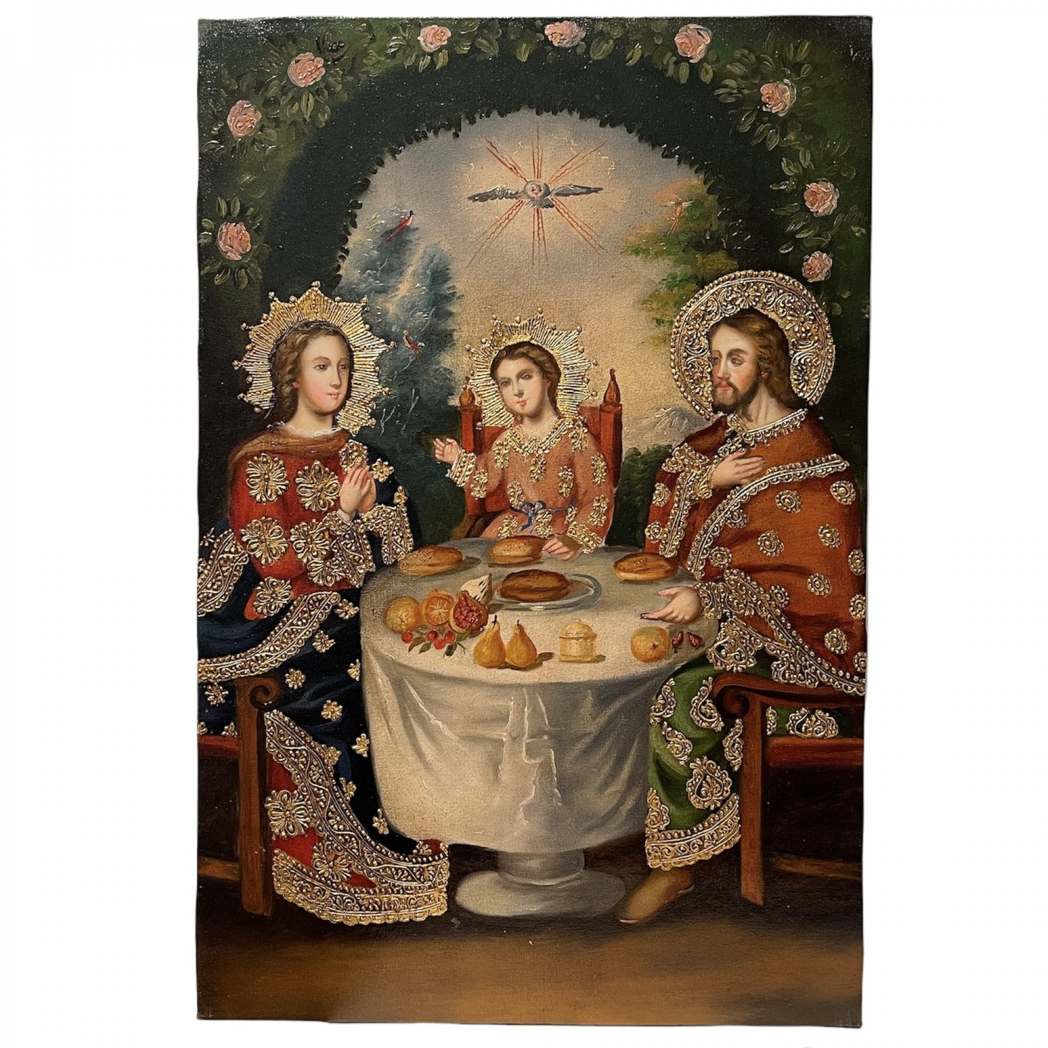 Sacra Famiglia a tavola. Tela dipinta a mano con colori ad olio, riproduzione dei classici dipinti barocco coloniali presenti nelle maggiori cattedrali di Cutzco. Le riproduzioni sono curate ed eseguite dai migliori maestri pittori e decoratori delle botteghe di Cutzco. La commistione tra le varie culture: la cultura pittorica spagnola e italiana delle immagini sacre seicentesche, combinata con l'arte decorativa delle opere d'arte fiamminghe, con l'aggiunta di elementi decorativi della cultura andina; da vita alla corrente artistica denominata Barocco Coloniale o Barocco andino. Misura tela cm 40 X 60.
