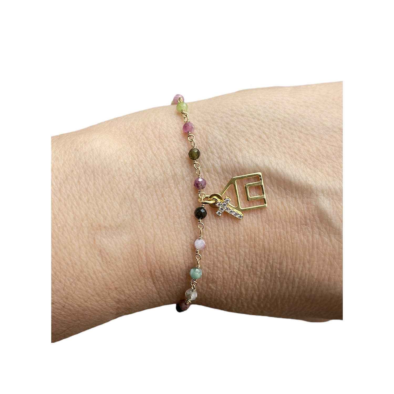 Bracciale con ciondoli in argento dorato 925, zirconi e tormaline.