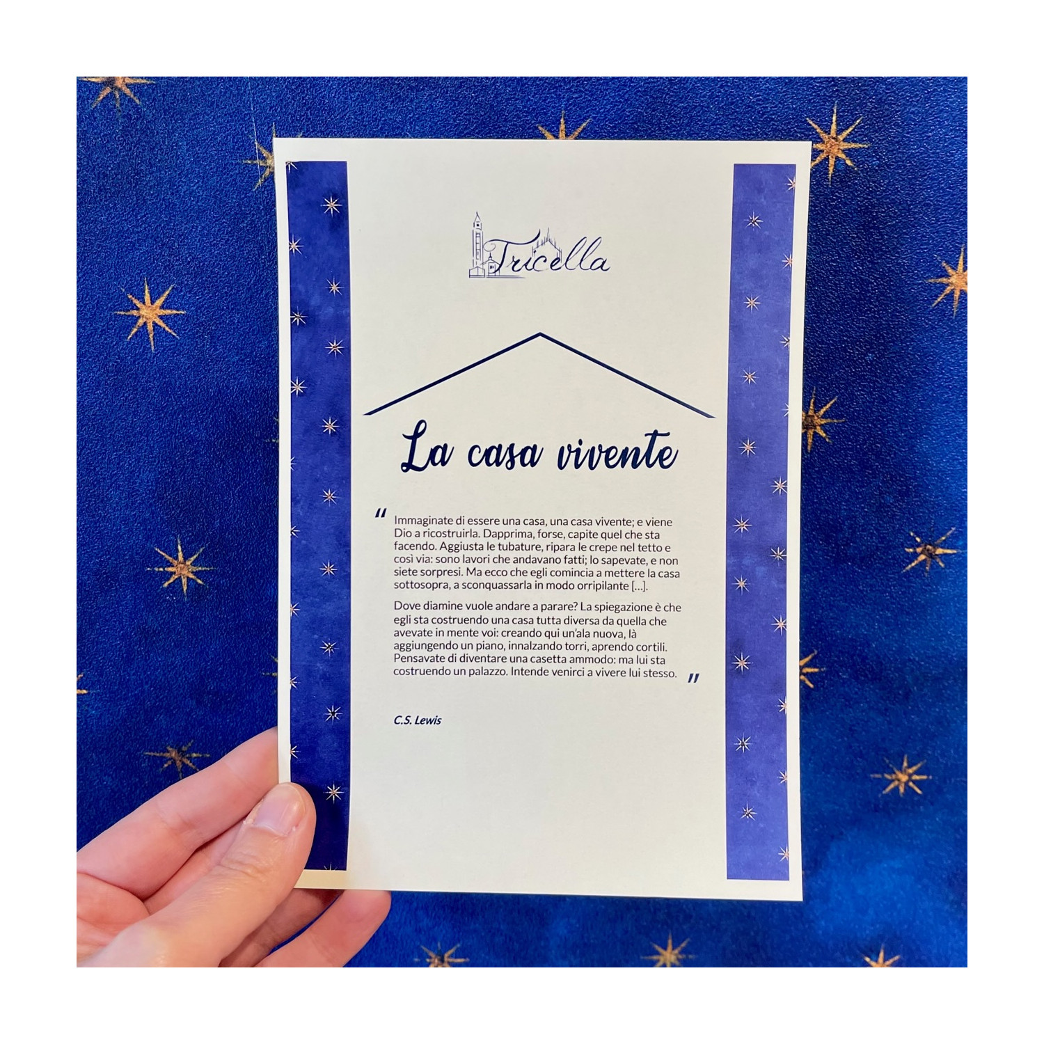 "Immaginate di essere una casa, una casa vivente; e viene Dio a ricostruirla. Dapprima, forse, capite quel che sta facendo. Aggiusta le tubature, ripara le crepe nel tetto e così via: sono lavori che andavano fatti; lo sapevate, e non siete sorpresi. Ma ecco che egli comincia a mettere la casa sottosopra, a sconquassarla in modo orripilante […]. Dove diamine vuole andare a parare? La spiegazione è che egli sta costruendo una casa tutta diversa da quella che avevate in mente voi: creando qui un’ala nuova, là aggiungendo un piano, innalzando torri, aprendo cortili. Pensavate di diventare una casetta ammodo: ma lui sta costruendo un palazzo. Intende venirci a vivere lui stesso." C.S. Lewis