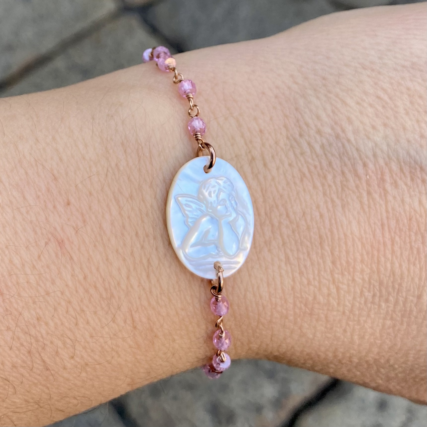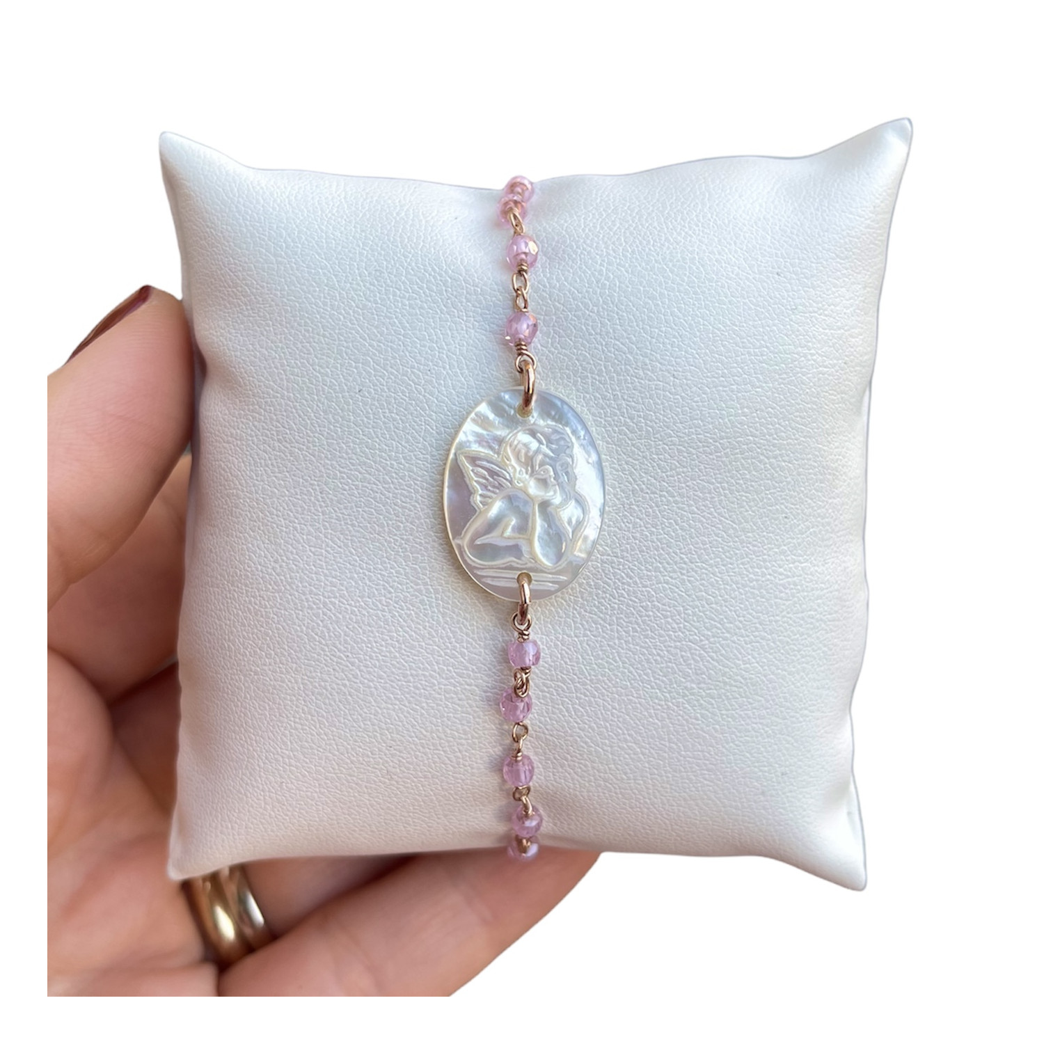 Bracciale in argento 925, zirconi rosa con angelo in madreperla.
