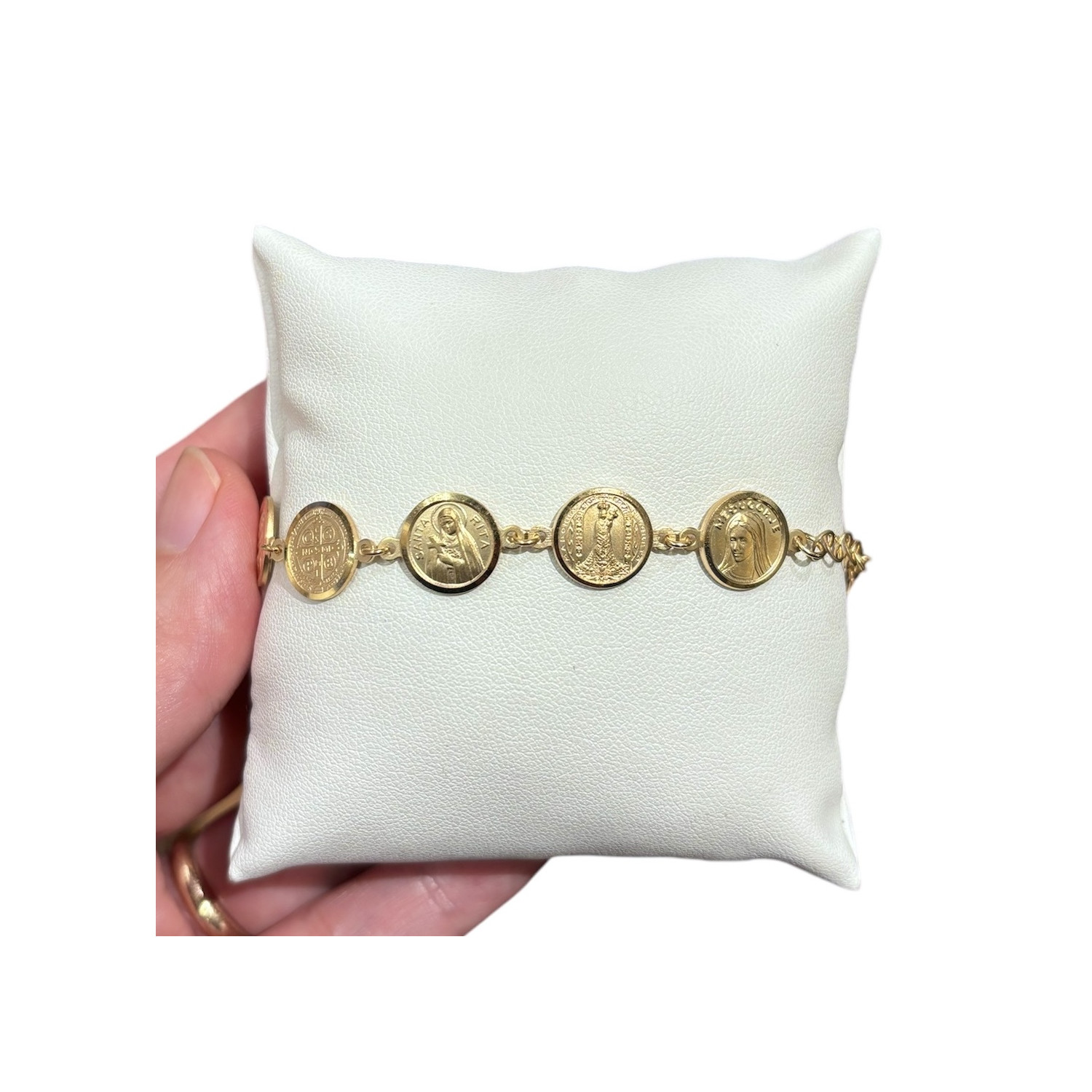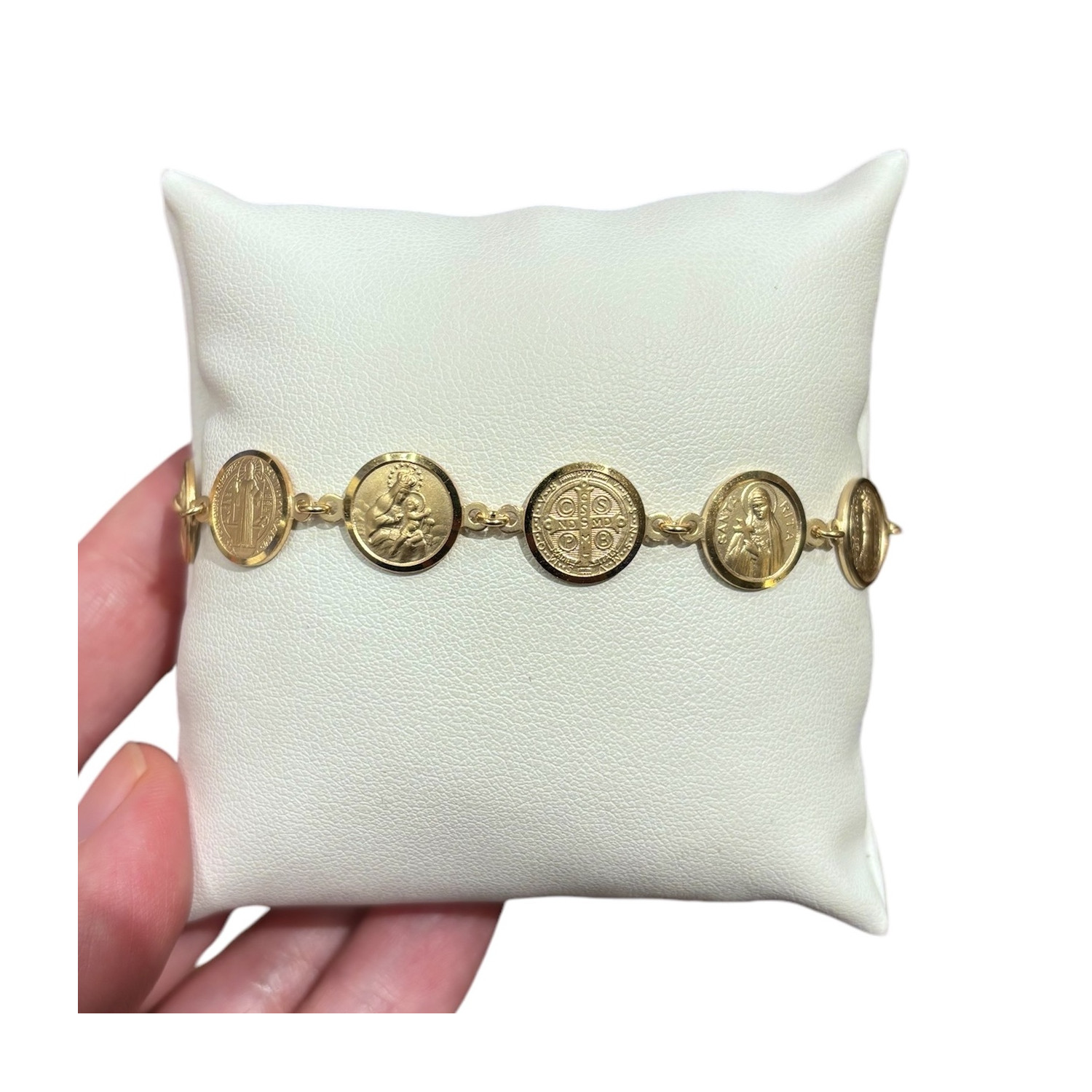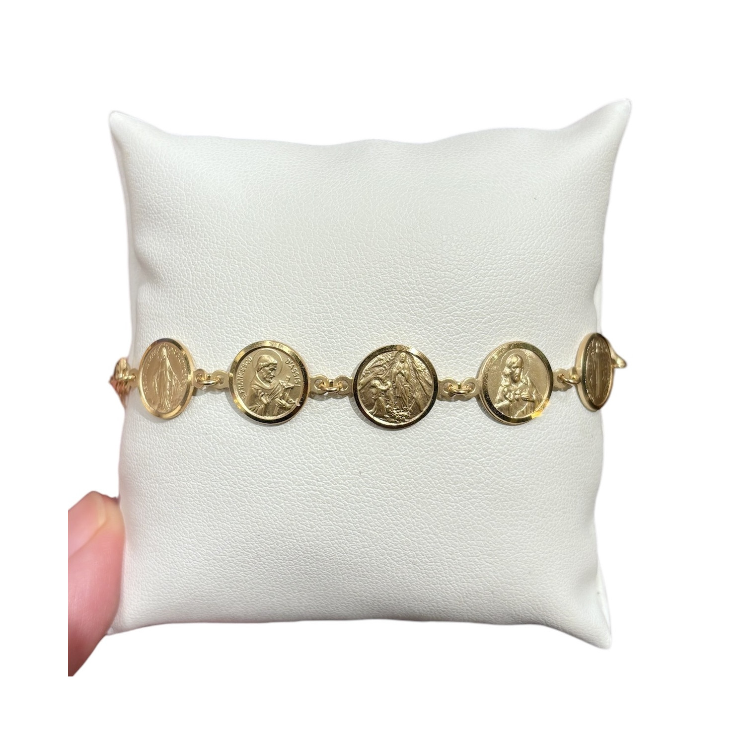 Bracciale in argento 925 dorato con medaglie assortite , misura grande diametro mm 11, misura piccola diametro medaglie mm 7 . Medaglie: Miracolosa, San Francesco, Lourdes, Sacro cuore di Gesù, San Benedetto fronte, Madonna del Carmine, San Benedetto retro, Santa Rita, Madonna di Loreto, Madonna di Medjugorje. Lunghezza bracciale regolabile cm 17,5/20, adatto sia per uomo che per donna.