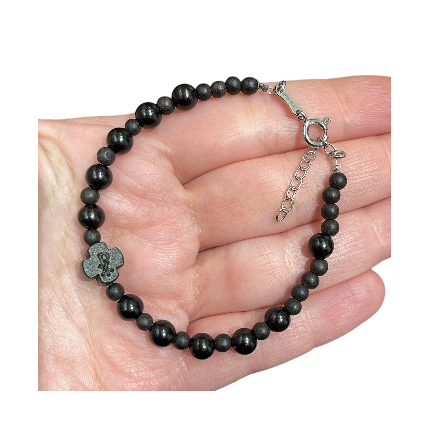 Bracciale rosario con grani in legno, crocetta centrale, chiusura in argento.