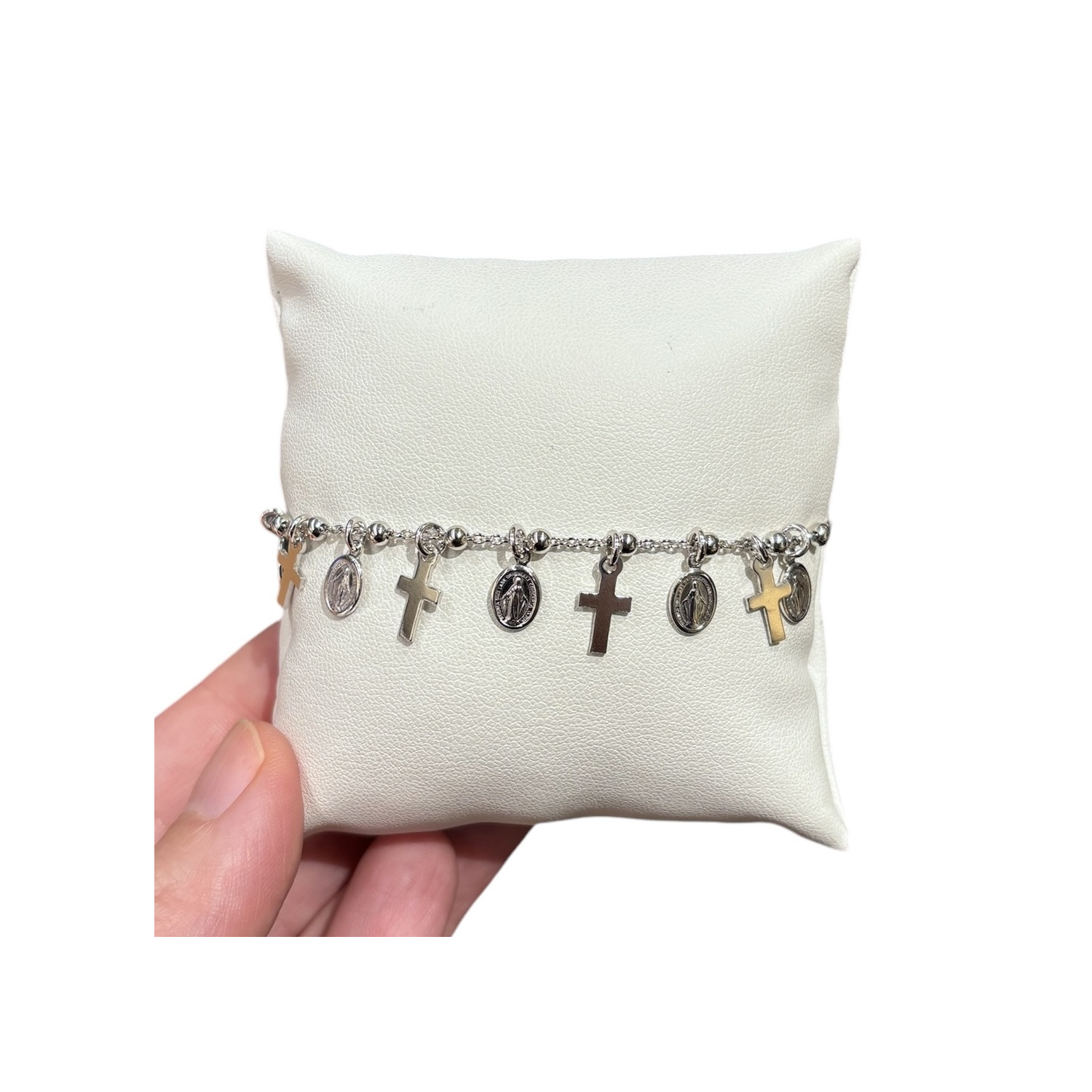 Bracciale decina rosario in argento 925 con medaglie miracolose in argento e croci pendenti.