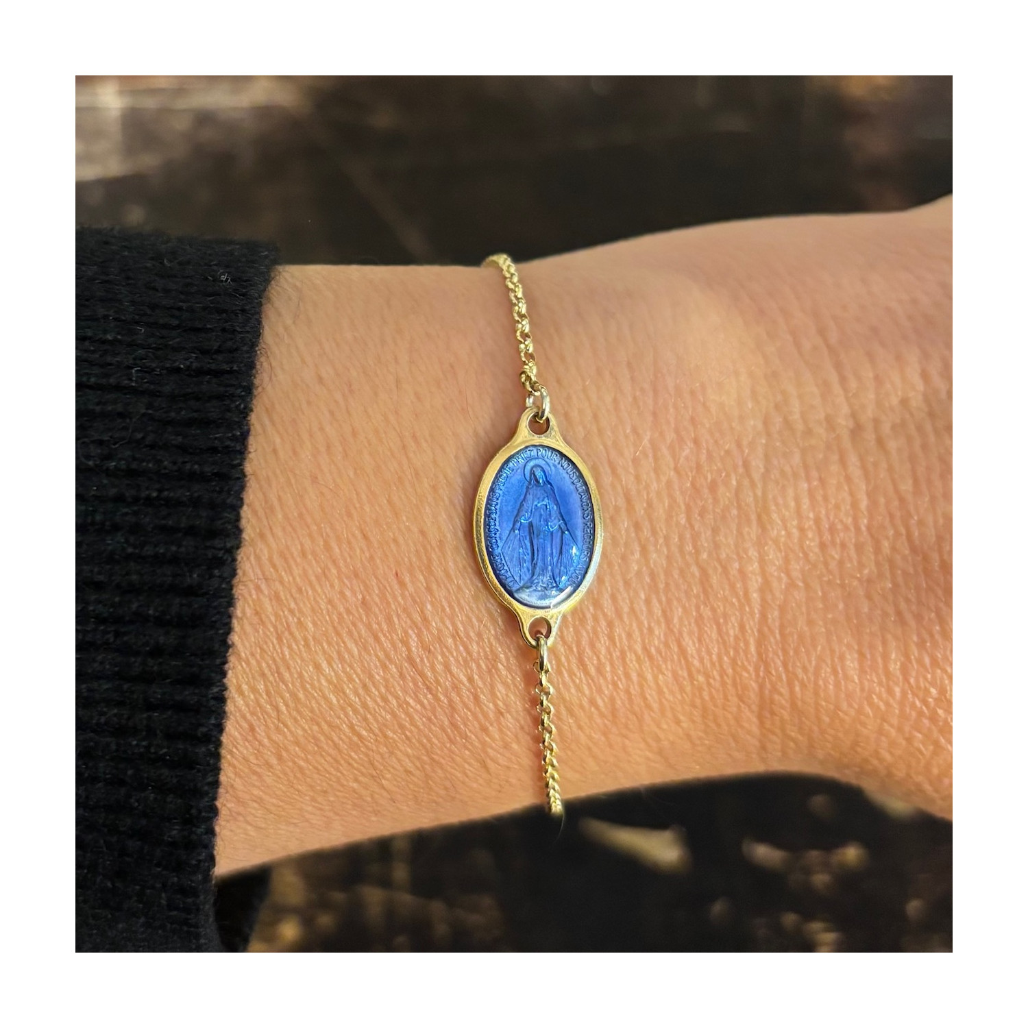 Bracciale con catena in argento 925 a lavorazione diamantata, sottile e luminosa. Al centro è inserita una medaglia miracolosa in ottone smaltato blu, proveniente dalla Cappella della Medaglia Miracolosa di Rue du Bac, a Parigi. lunghezza cm: 16,5-18,5