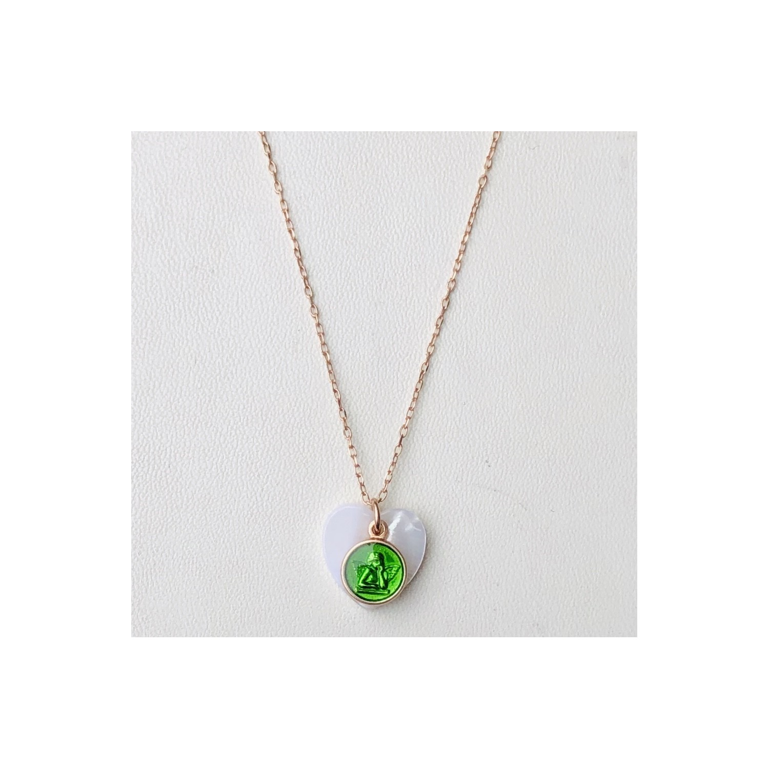 Collana in argento rosato con ciondolo in madre perla e angelo.