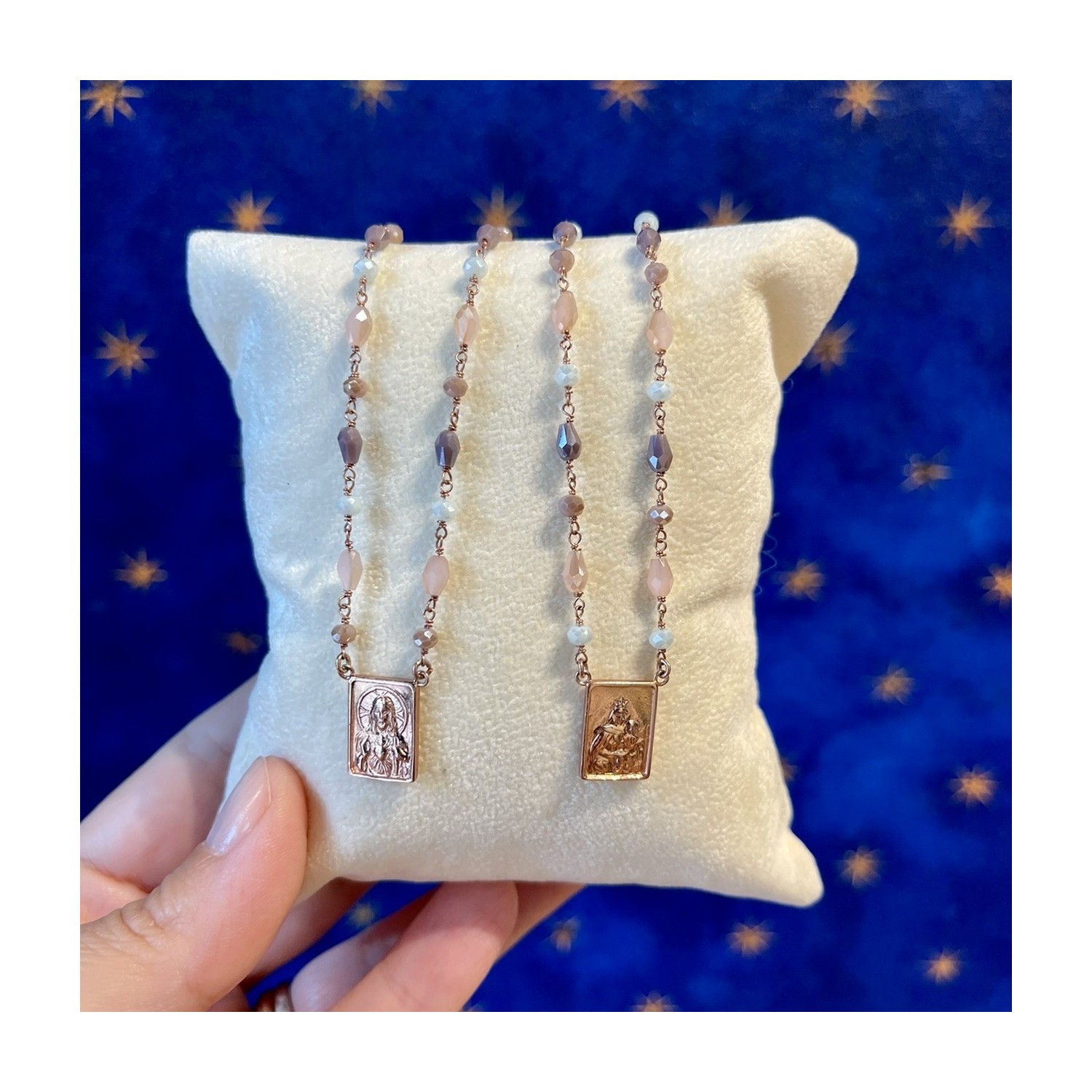Collana scapolare in argento 925 bagno oro rosa e zaffiri. Lunghezza collana cm 80, montatura rosario legatura eterna; doppia placca scapolare da portare sul petto e sulla schiena, garanzia e card spiegazione scapolare inclusa nella confezione. Su richiesta è possibile personalizzare la lunghezza della collana.