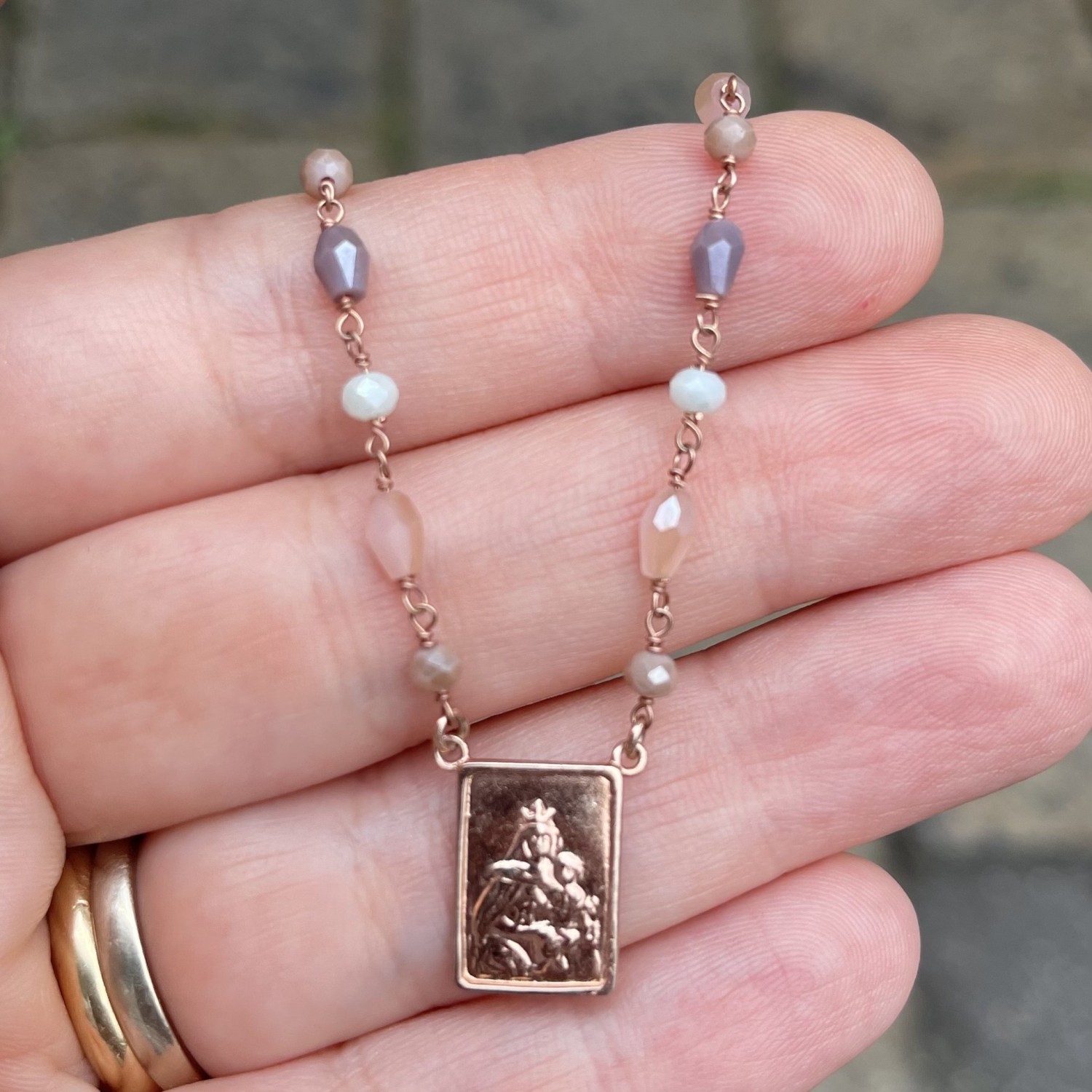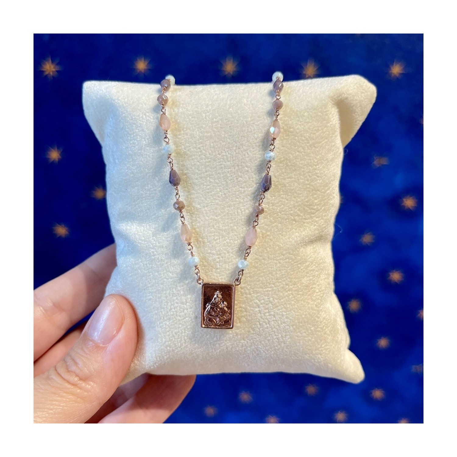 Collana scapolare in argento 925 bagno dorato e zaffiri. Lunghezza collana cm 40 con allunghino fino a cm 45, montatura rosario legatura eterna; placca scapolare doppio conio, garanzia e card spiegazione scapolare inclusa nella confezione. Su richiesta è possibile personalizzare la lunghezza della collana.