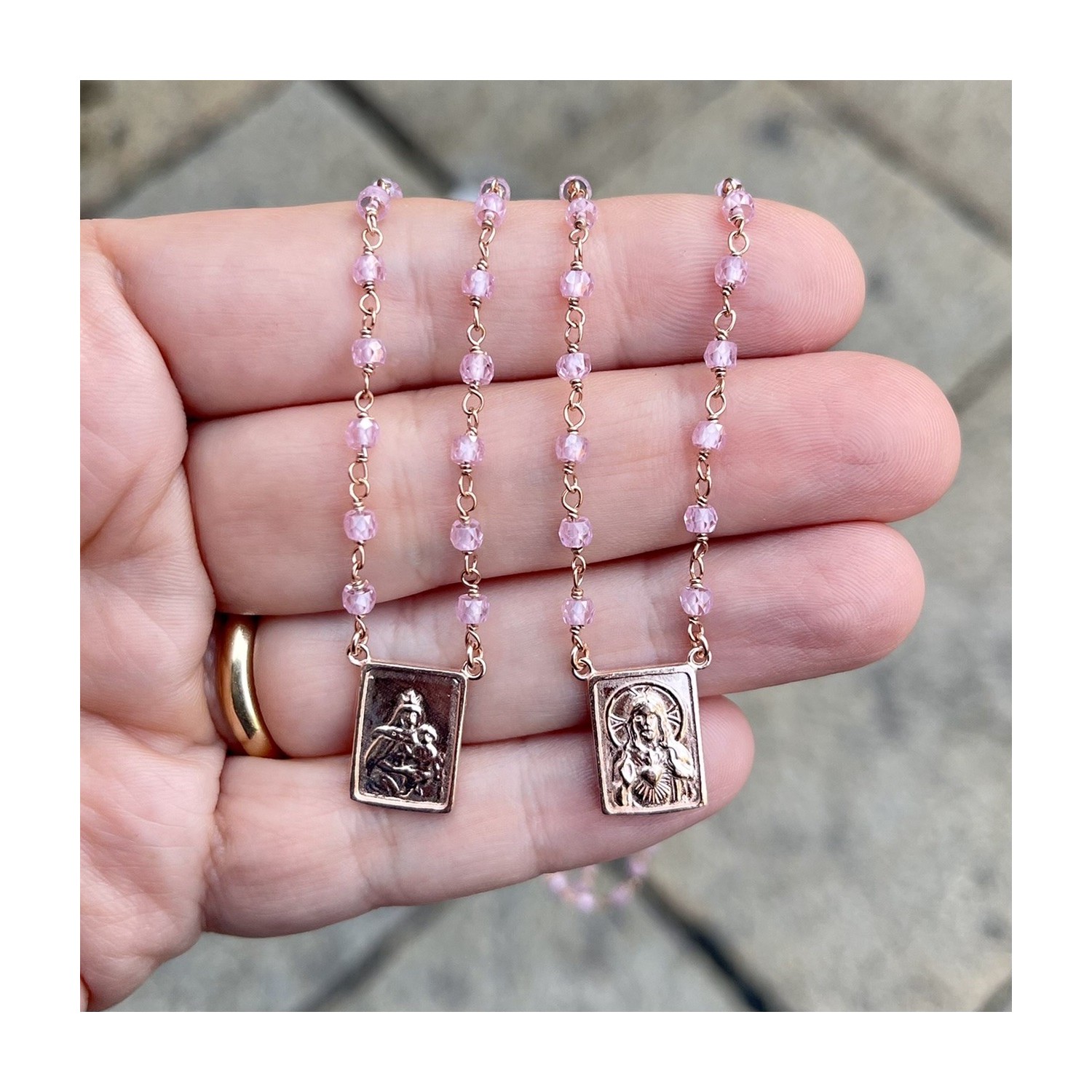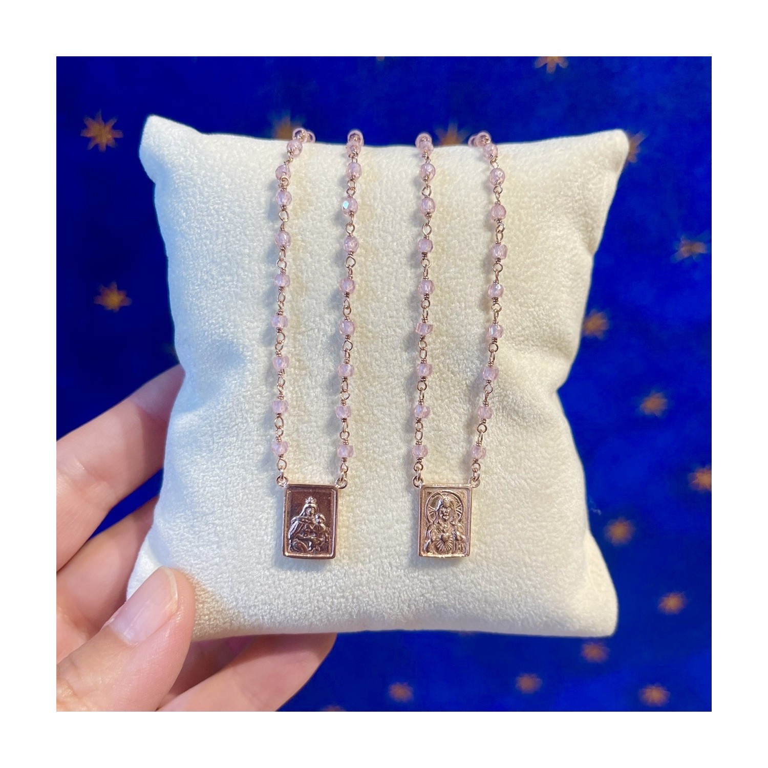 Collana scapolare in argento 925 bagno oro rosa e zaffiri. Lunghezza collana cm 80, montatura rosario legatura eterna; doppia placca scapolare da portare sul petto e sulla schiena, garanzia e card spiegazione scapolare inclusa nella confezione. Su richiesta è possibile personalizzare la lunghezza della collana.