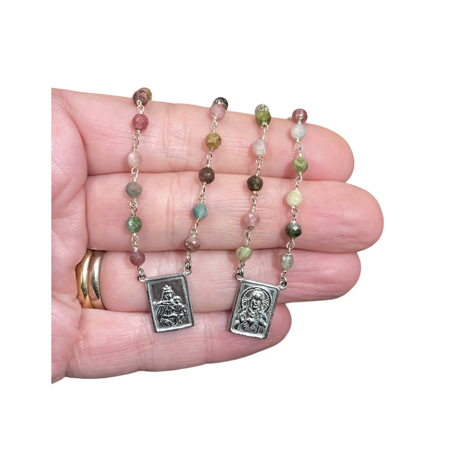 Collana scapolare in argento 925 bagno dorato e tormaline. Lunghezza collana cm 80, diametro tormaline mm 4, montatura rosario legatura eterna; doppia placca scapolare da portare sul petto e sulla schiena, garanzia e card spiegazione scapolare inclusa nella confezione. Su richiesta è possibile personalizzare la lunghezza della collana.