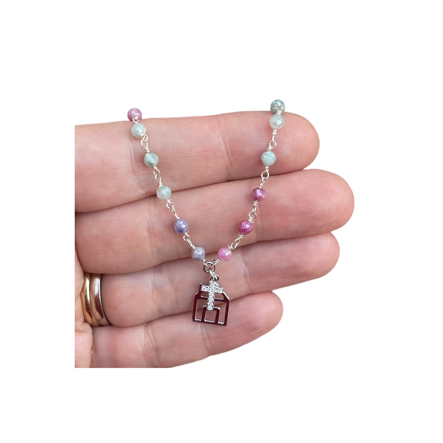 Collana in argento 925 con zirconi colorati, ciondolo in argento 925 e zirconi. Lunghezza collana cm 40, regolabile fino a cm 45. Racconto casa vivente incluso.