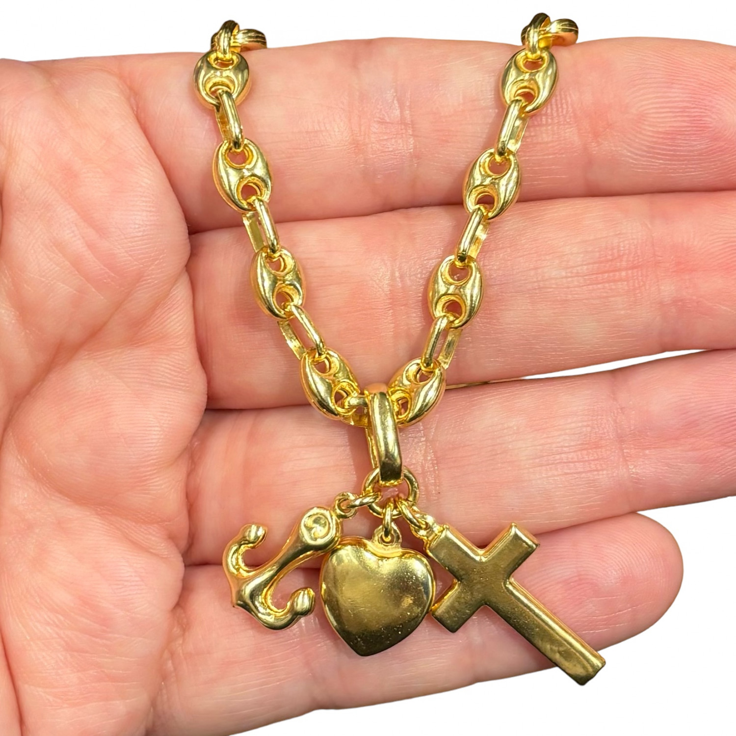 Collana in argento massiccio 925, bagno oro 18 carati con pendente fede, speranza, carità.