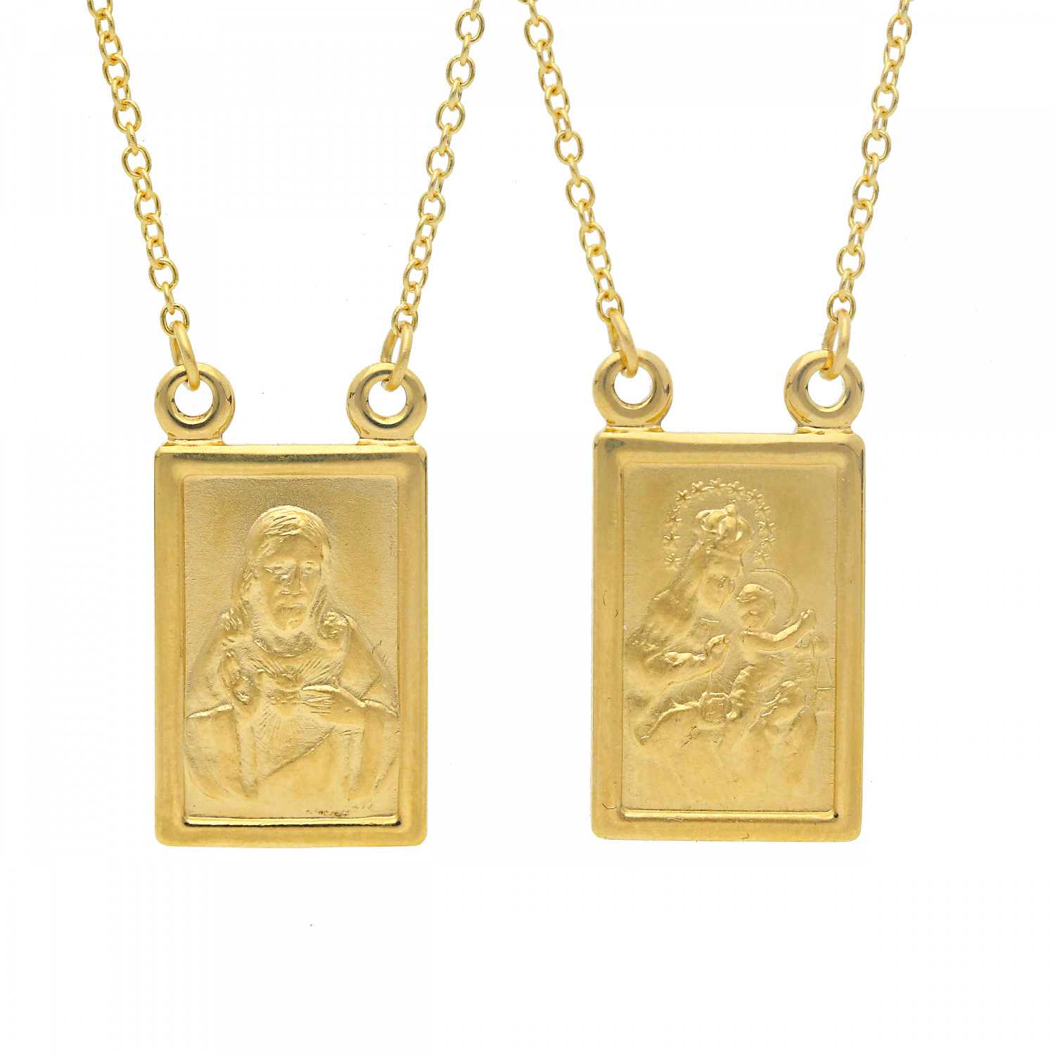 Collana scapolare in oro 18 Kt, adatta sia per uomo che per donna, lunghezza complessiva cm 70, peso gr 6,40. La devozione dello scapolare nasce il 16 luglio del 1251 quando la Vergine Maria apparve a San Simone Stock come risposta alle sue sincere preghiere di assistenza. Mostrando lo scapolare gli disse: "prendi questo Scapolare, chiunque muoia indossandolo non patirà il fuoco dell'inferni. Esso sarà simbolo di salvezza, protezione dai pericoli, promessa di pace.