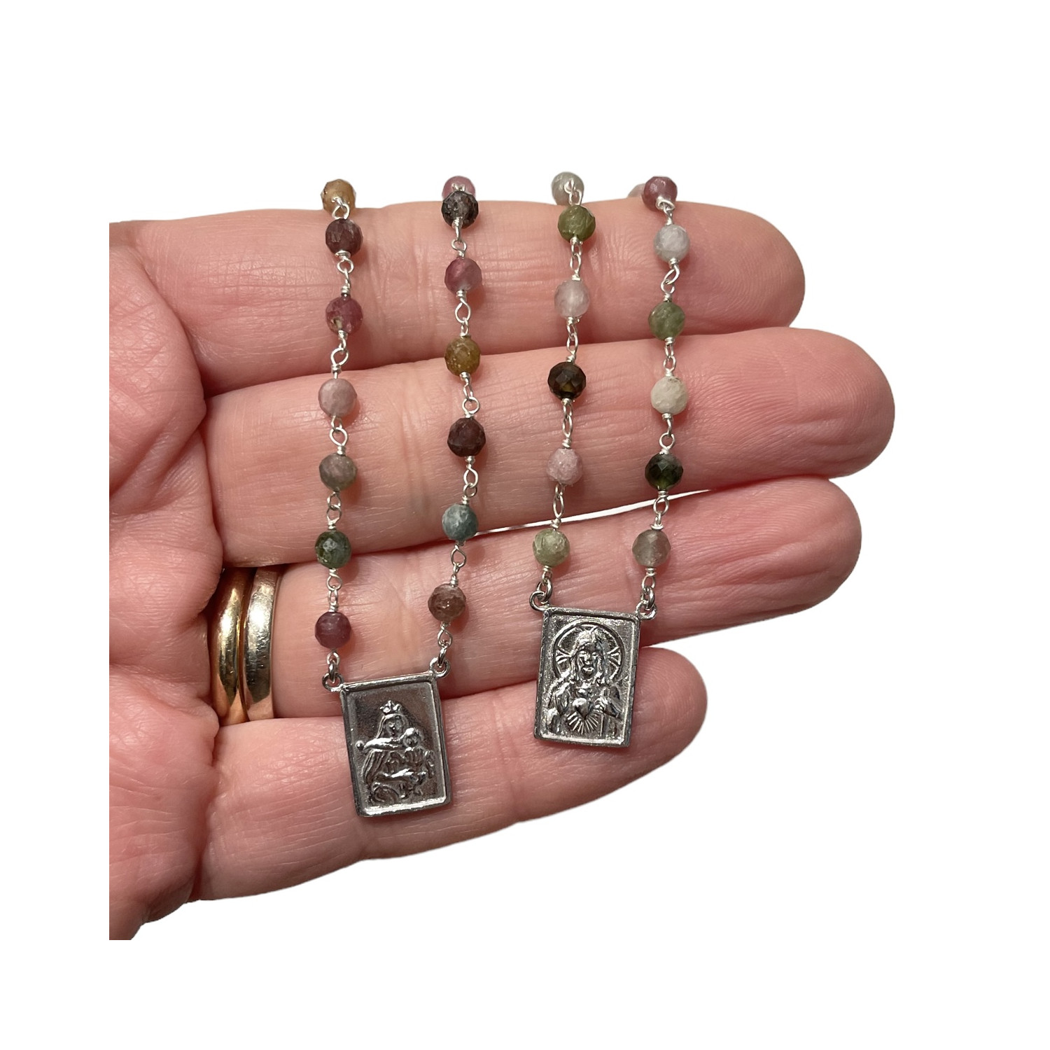 Collana scapolare in argento 925 e tormaline. Lunghezza complessiva cm 73; si indossa infilandolo dalla testa. Le due placche hanno le due immagini della Madonna del Carmelo e del Sacro Cuore di Gesù.