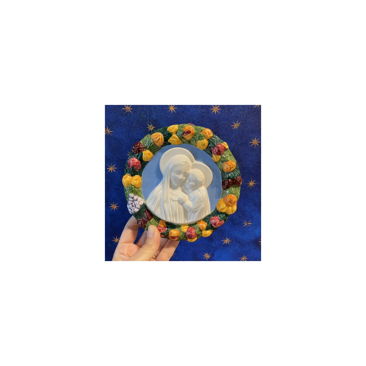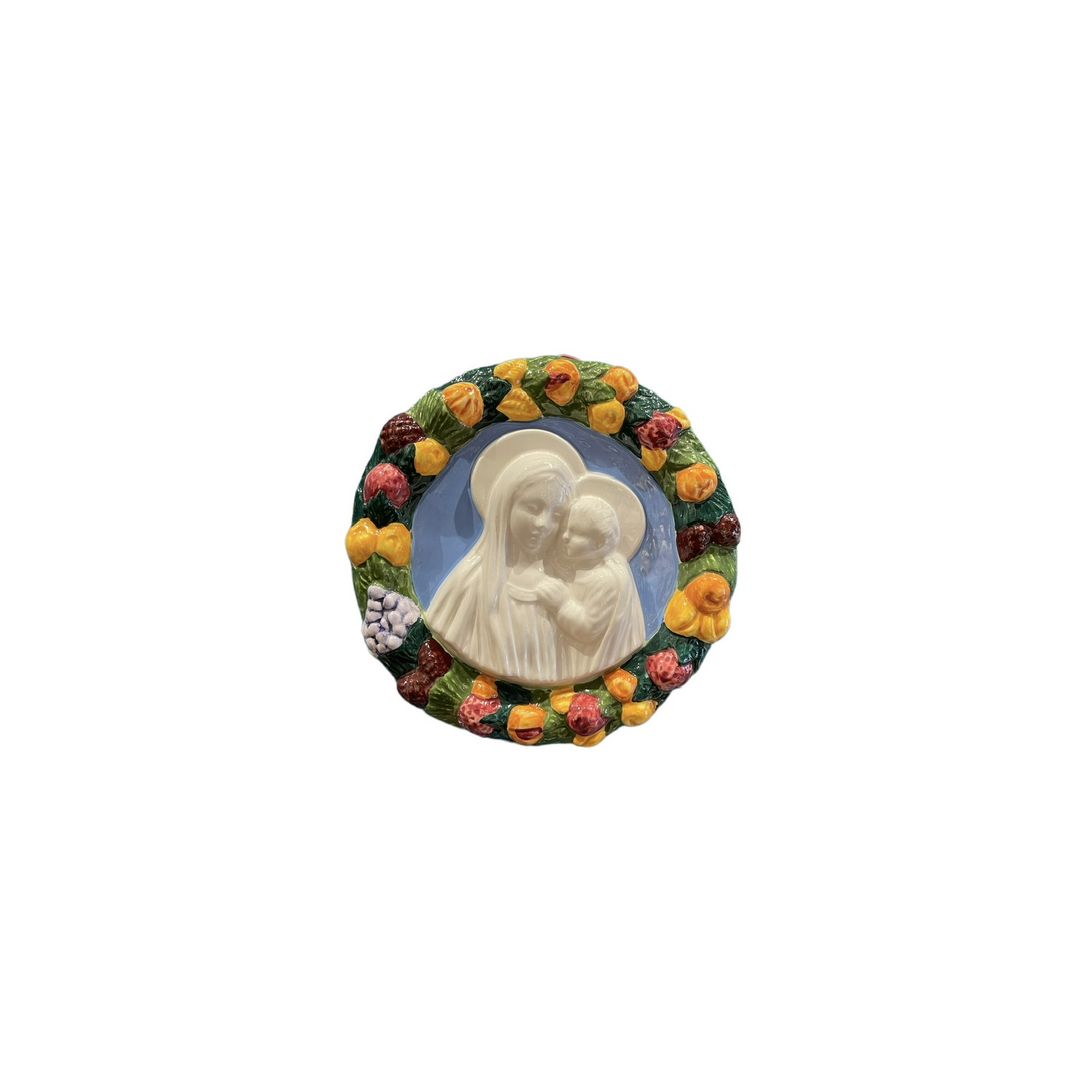 Piccolo tondo in ceramica tipo Della Robbia. Madonna con bambino