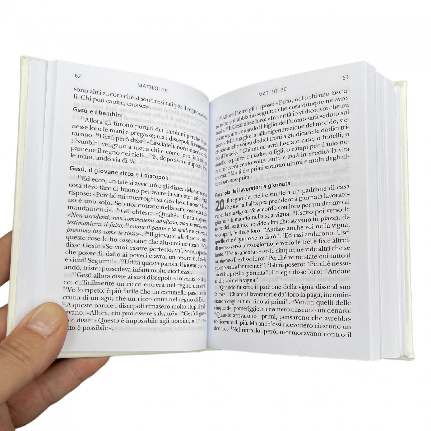 Vangelo e atti degli Apostoli con copertina in pelle bianca e placca in argento.