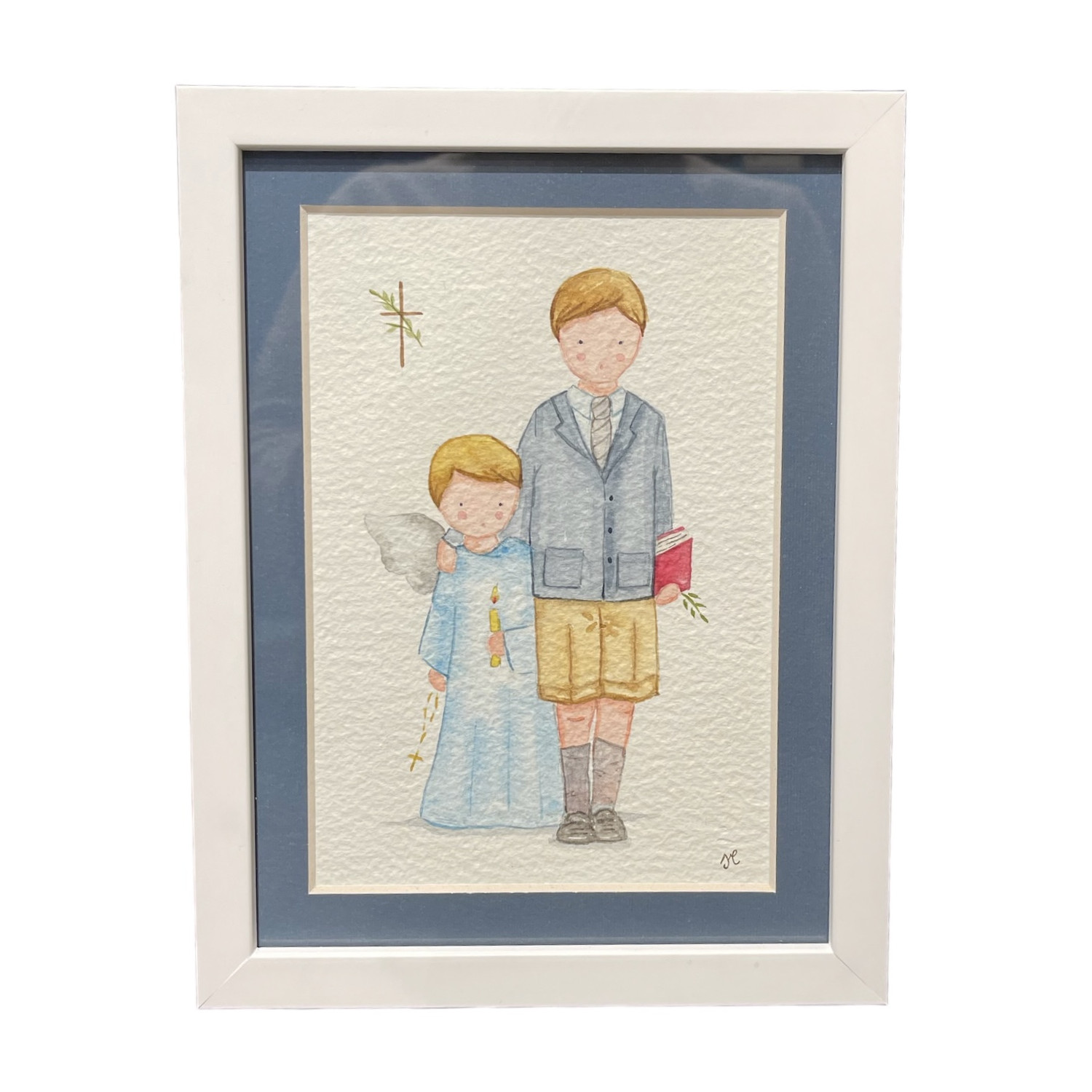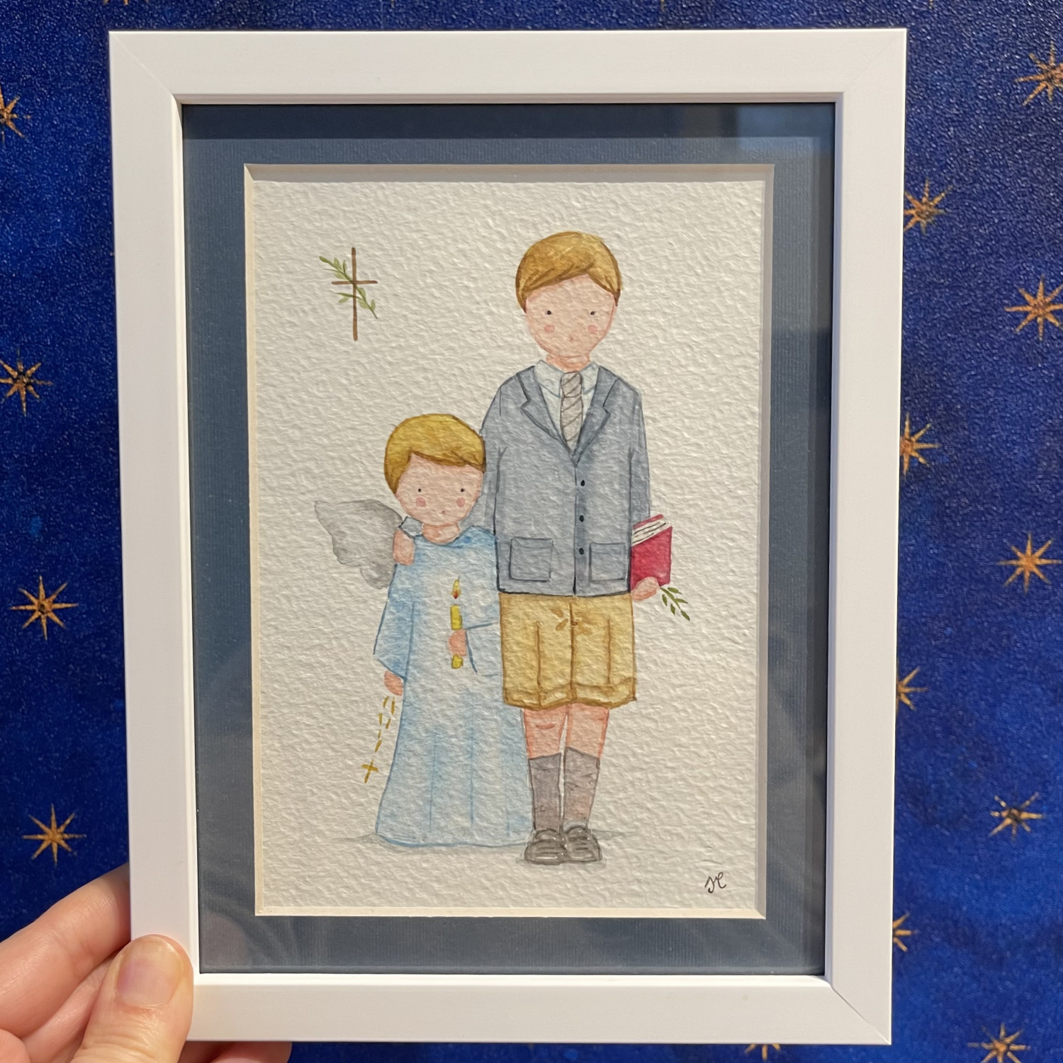 Quadretto acquarello fatto a mano con angelo custode e ragazzo per prima comunione o cresima.