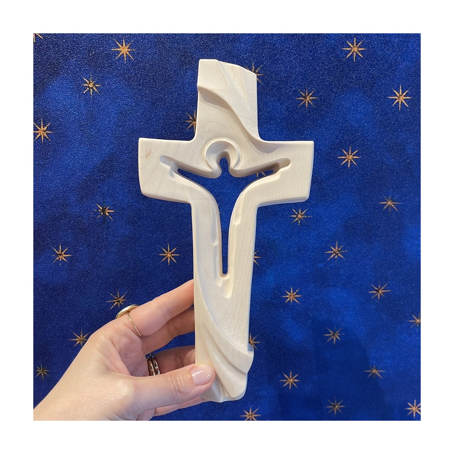 Crocefisso risorto intagliato in negativo in una croce di acero, finitura naturale, scolpita a mano dai maestri scultori della Val Gardena.
