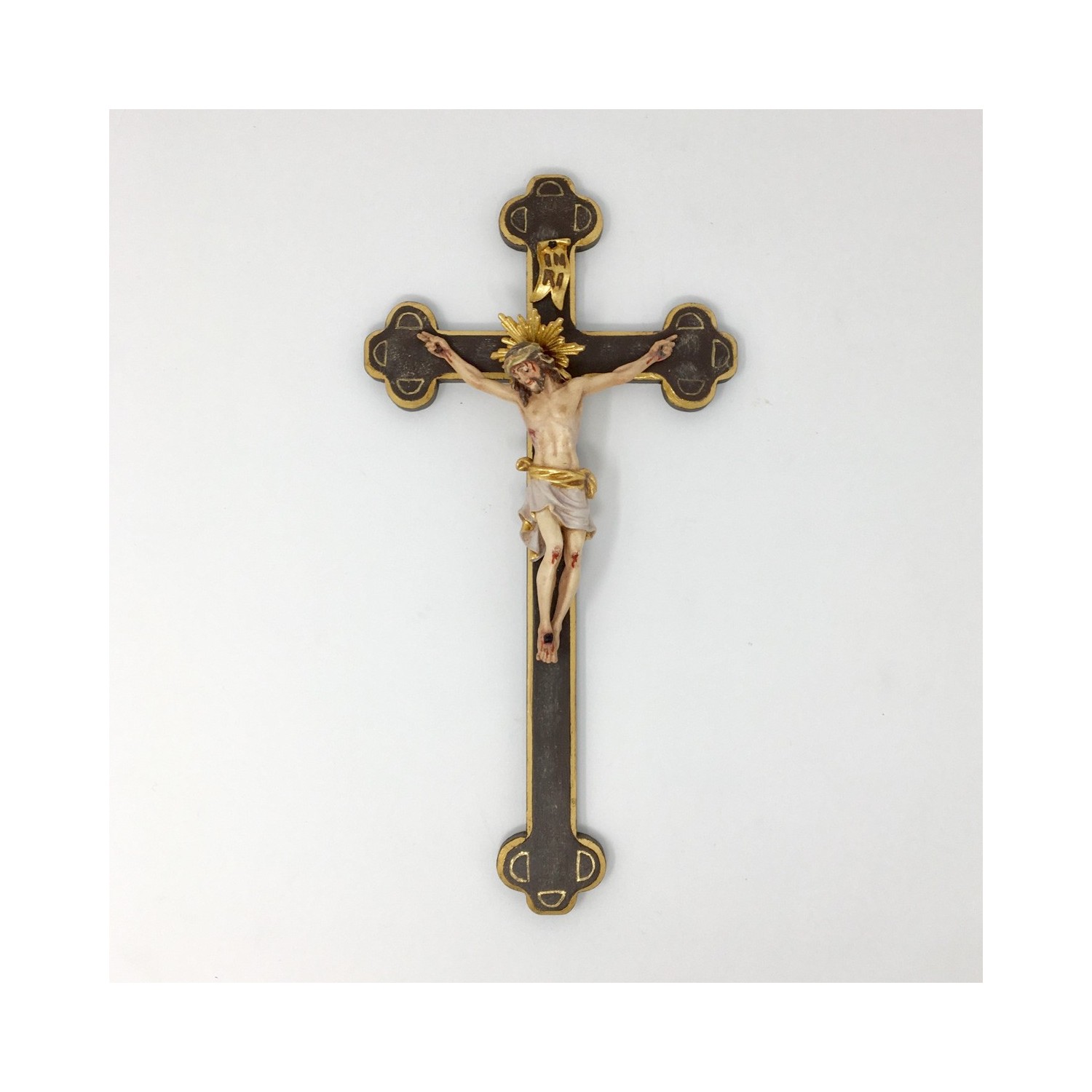 Crocefisso in legno scolpito e dipinto a mano dai maestri scultori in Val Gardena. Dipinto con colori ad olio, finitura antichizzata, croce trilobata.Da appendere.