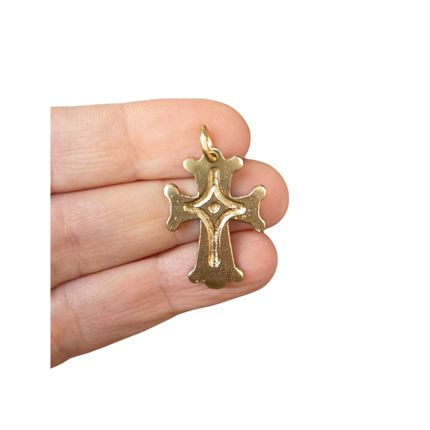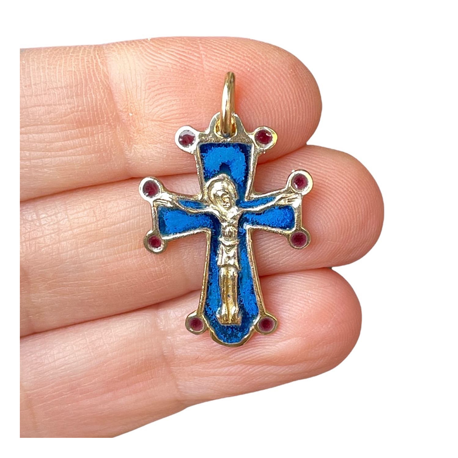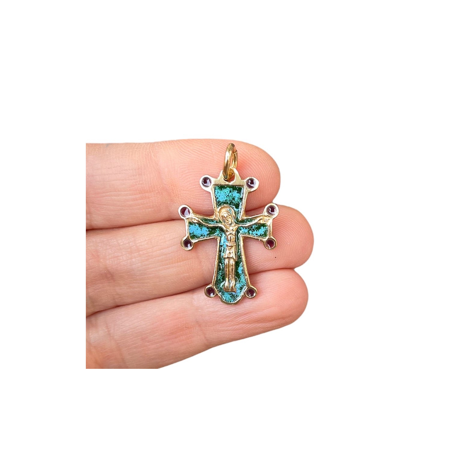 Croce in bronzo dorato con smalto a fuoco.