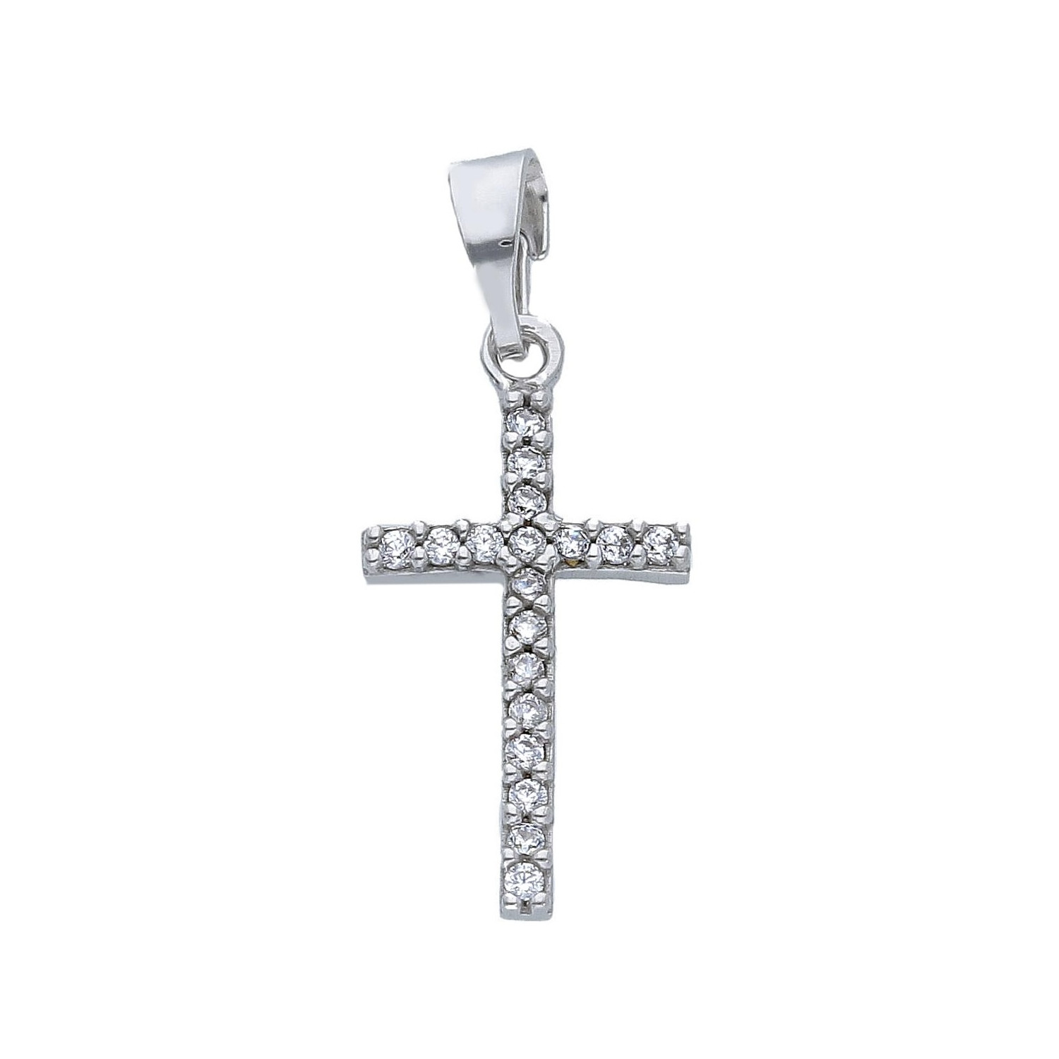 Croce in oro 18 bianco carati con zirconi incassati.