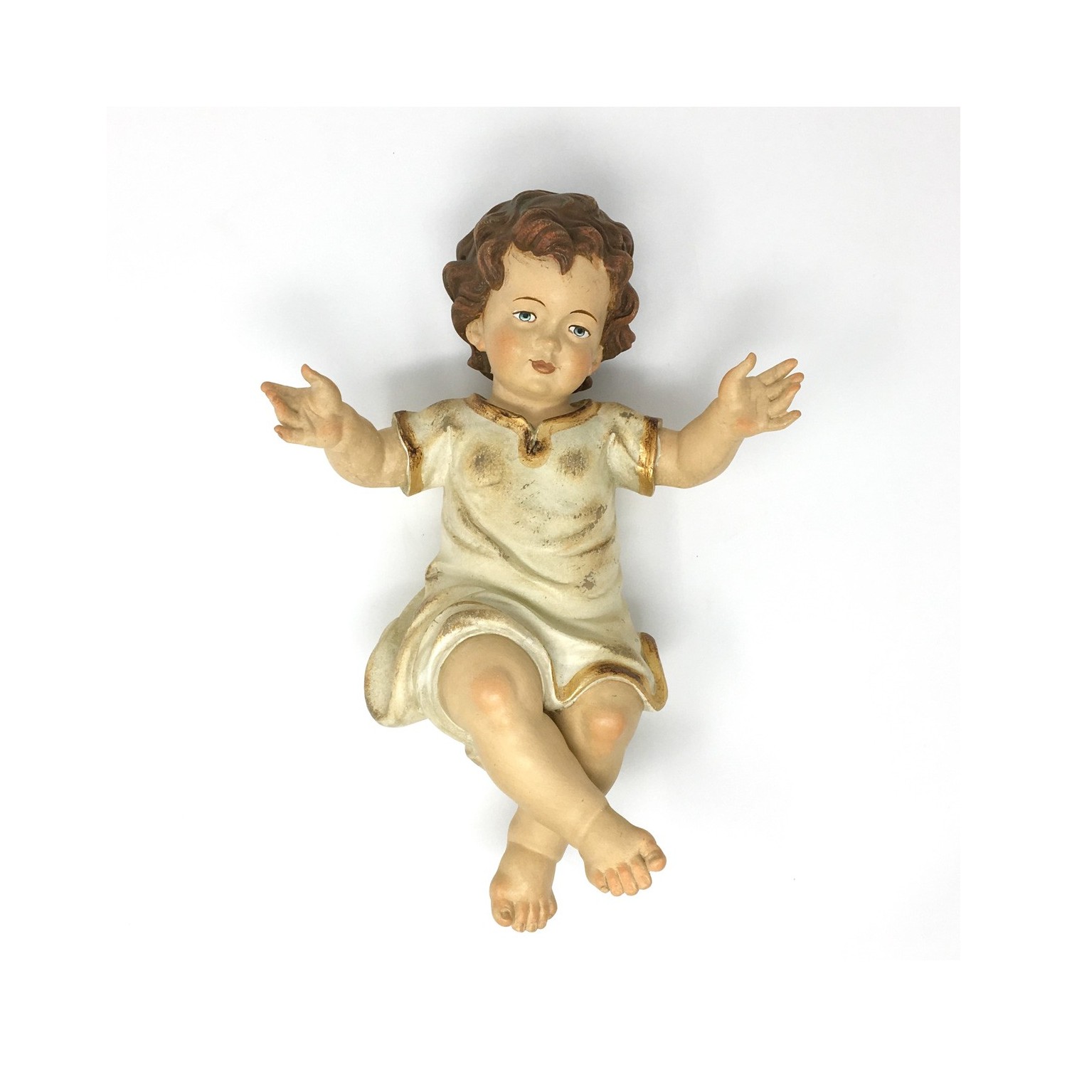 Gesù bambino in legno scolpito a mano in legno dai maestri scultori della Val Gardena, dipinto a mano con finitura antichizzata.