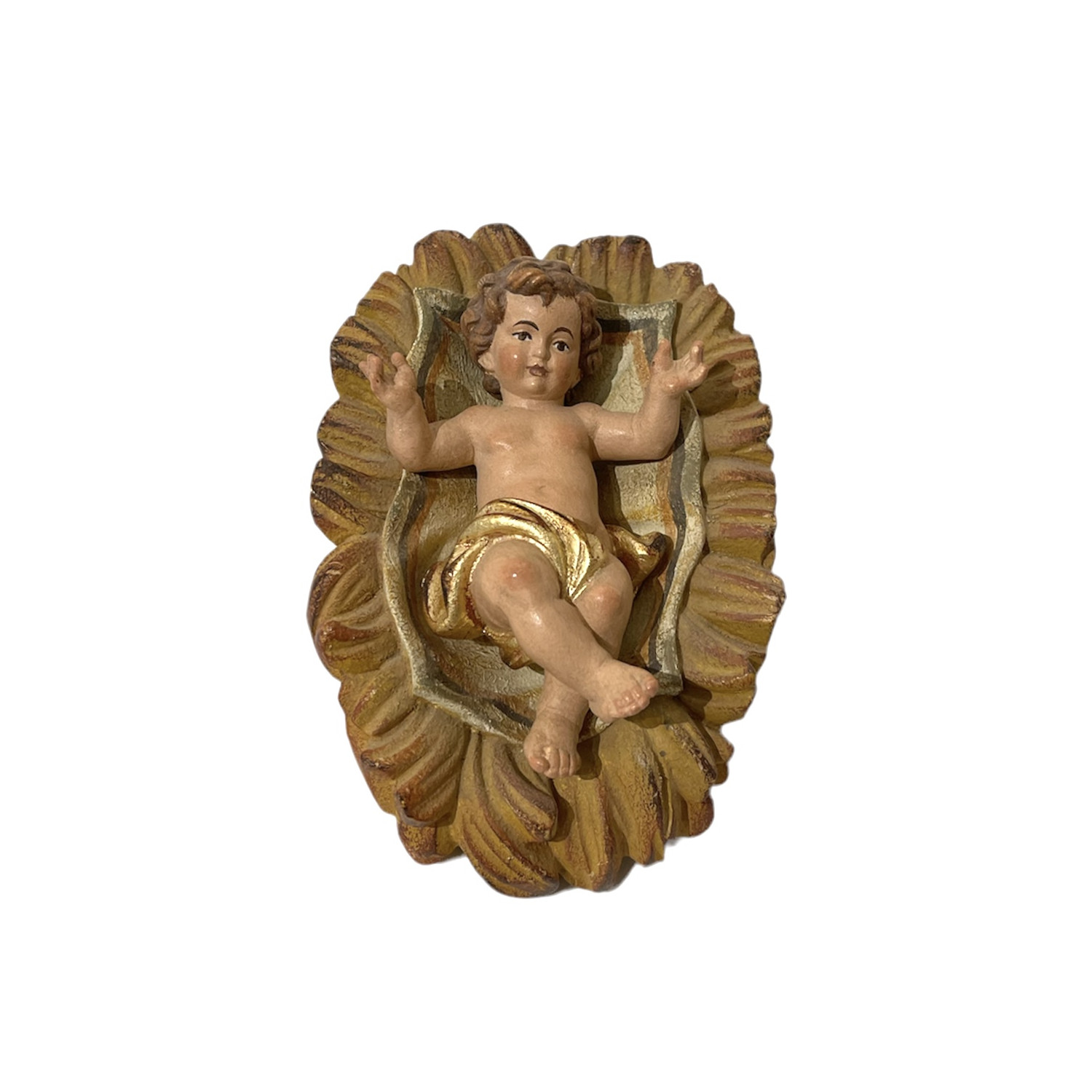 Gesù Bambino in legno antichizzato nudo con culla
