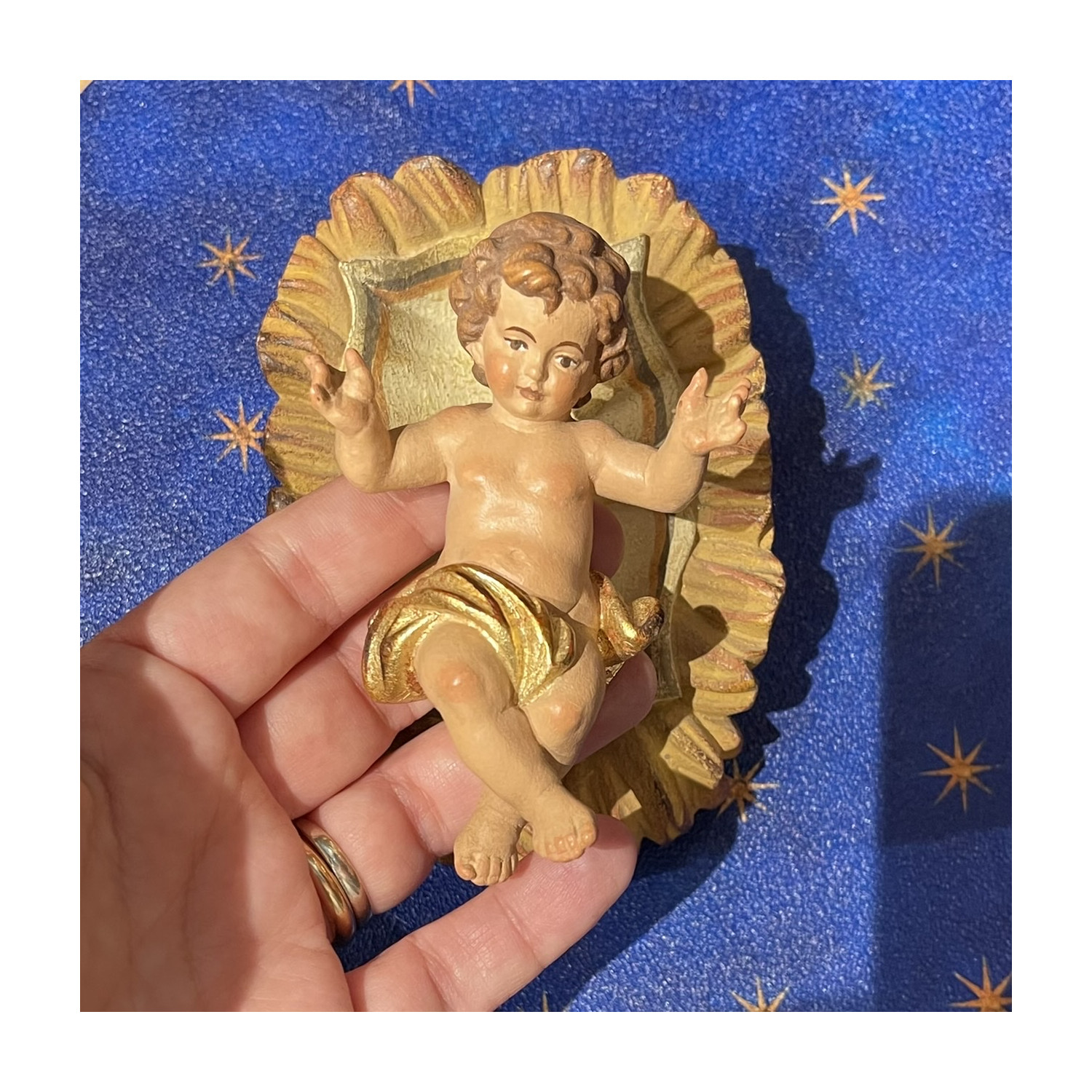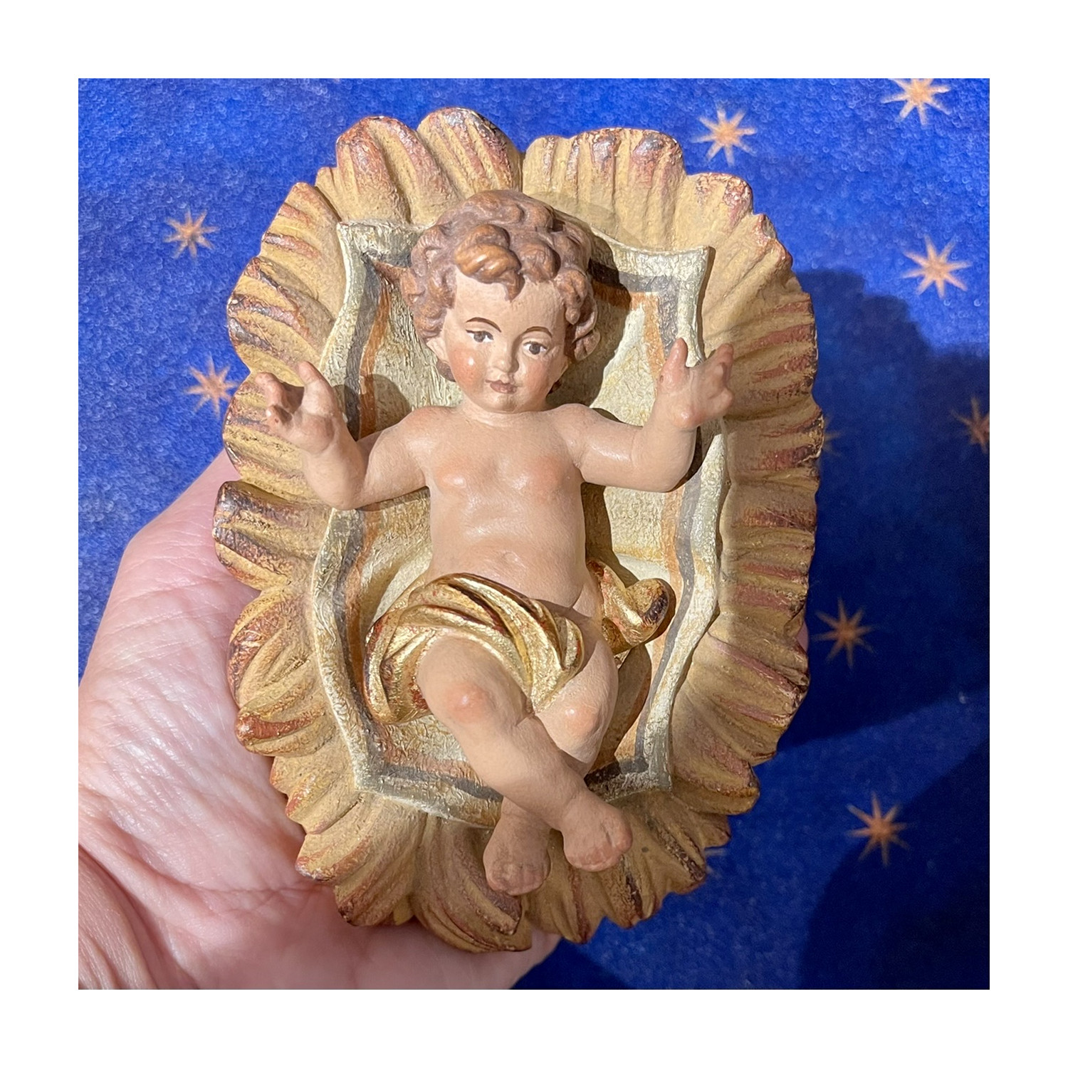 Gesù bambino in legno scolpito a mano dipinto con antichizzazione.