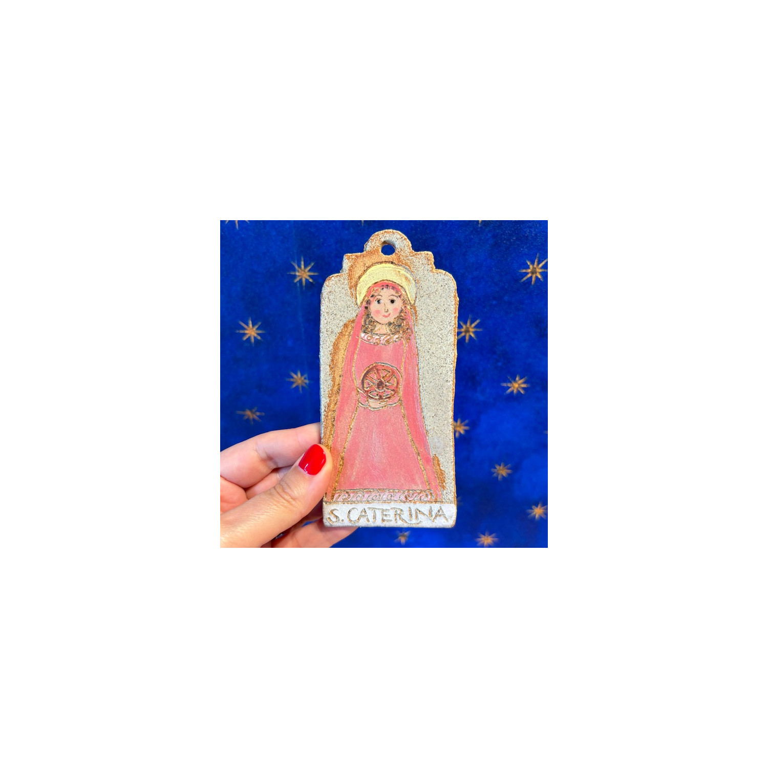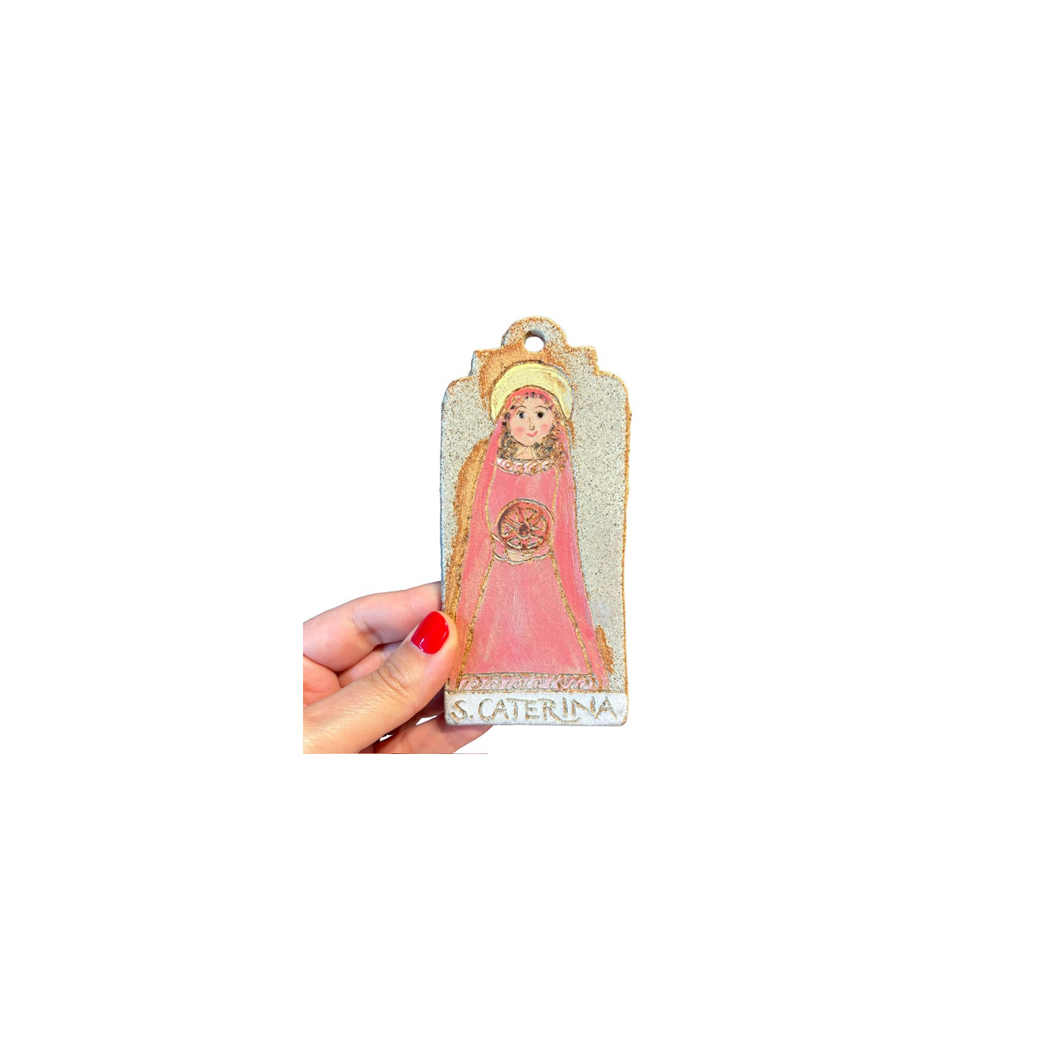 Santa Caterina in grès fatto a mano, design esclusivo della nostra ceramista Tania. Da appendere.