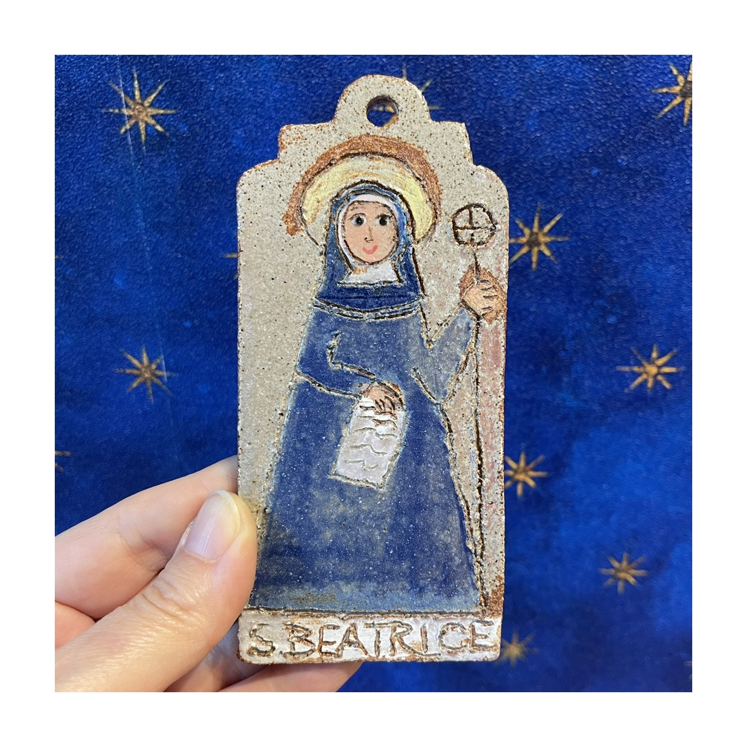 Piccolo pannello da appendere in grès fatto a mano raffigurante Santa Beatrice. Design esclusivo della nostra ceramista Tania; Tania, da oltre 20 anni crea per noi oggetti speciali fatti a mano con il suo stile unico. Ogni creazione è un pezzo unico, creato da Tania in esclusiva per la nostra bottega e per il nostro shop online; grazie al suo stile inconfondibile e alla sua sensibilità, queste opere incontrano sempre di più il gradimento dei nostri affezionati clienti.