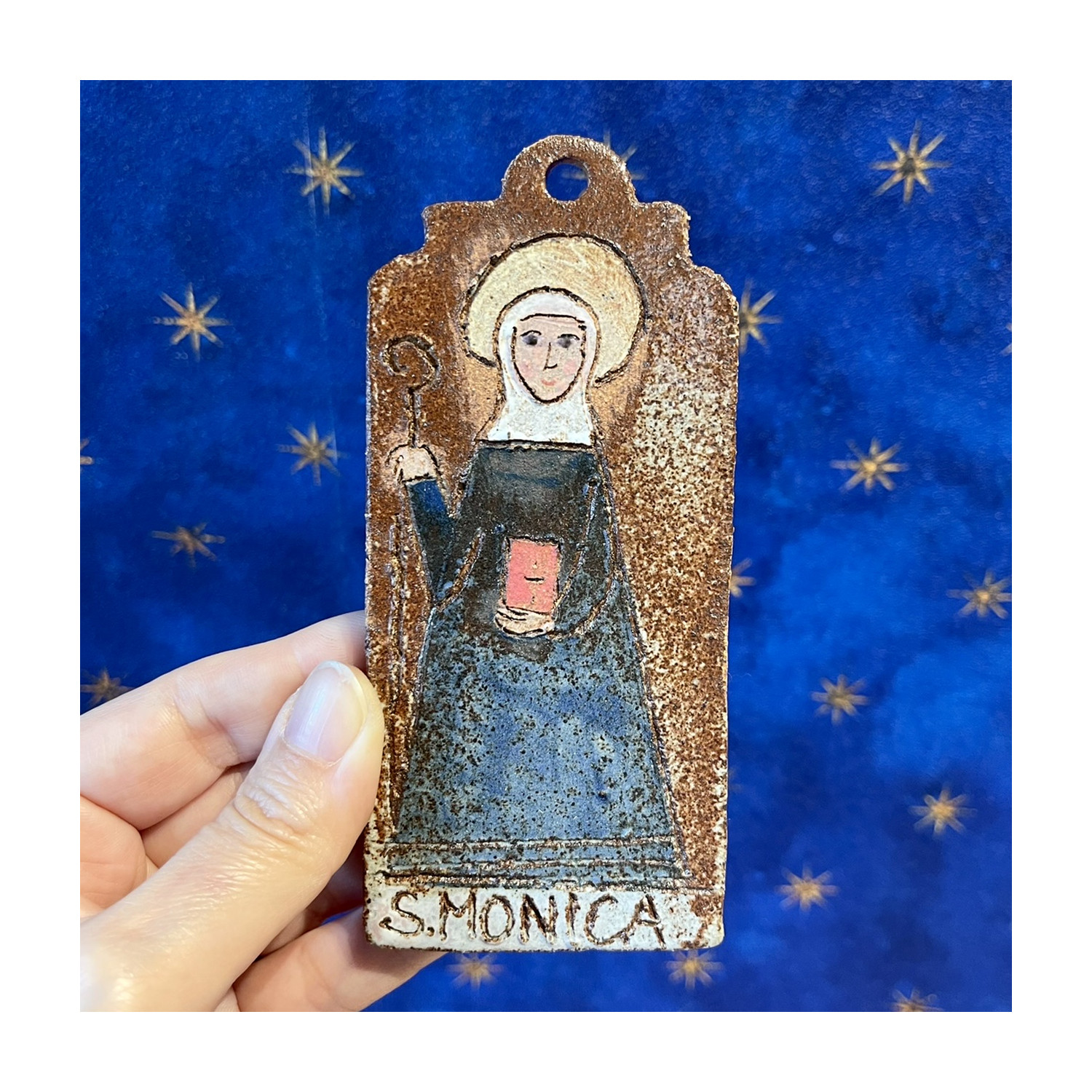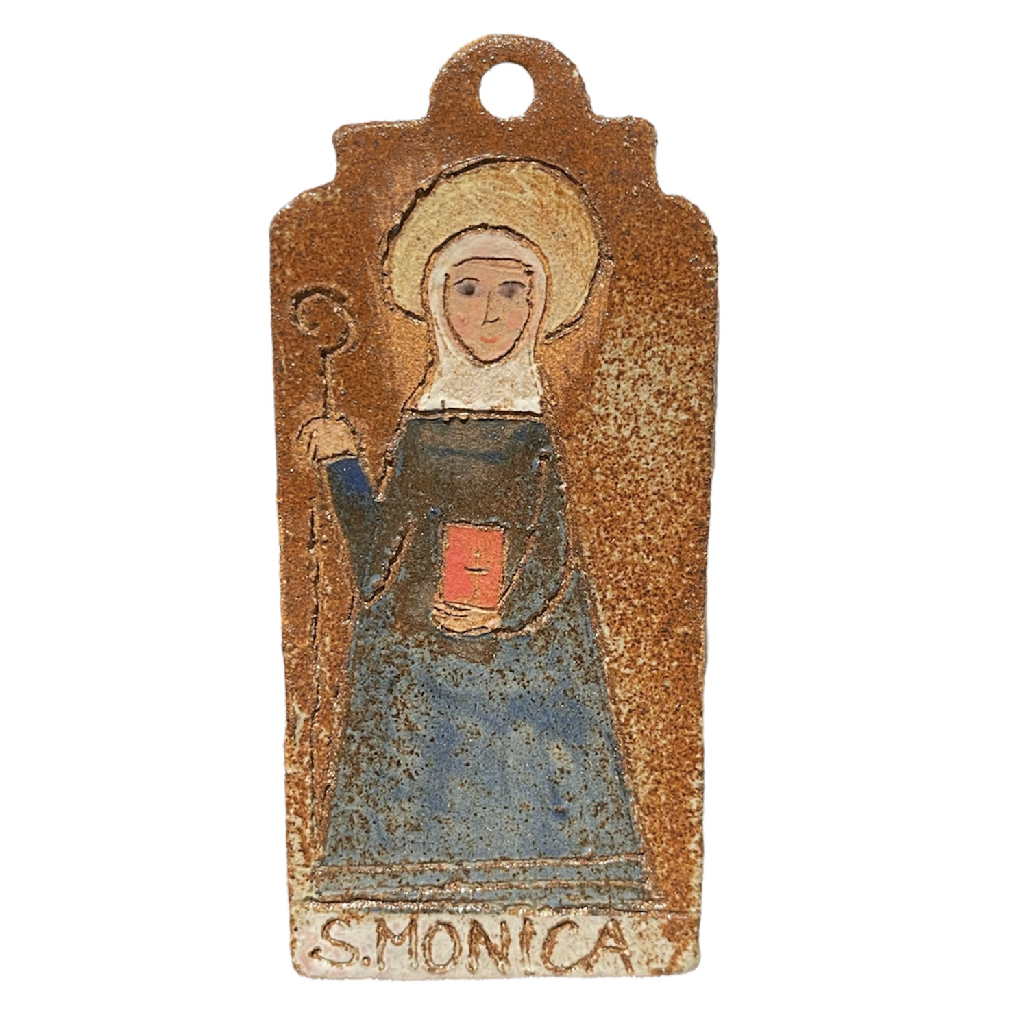 Piccolo pannello da appendere in grès fatto a mano raffigurante Santa Monica.