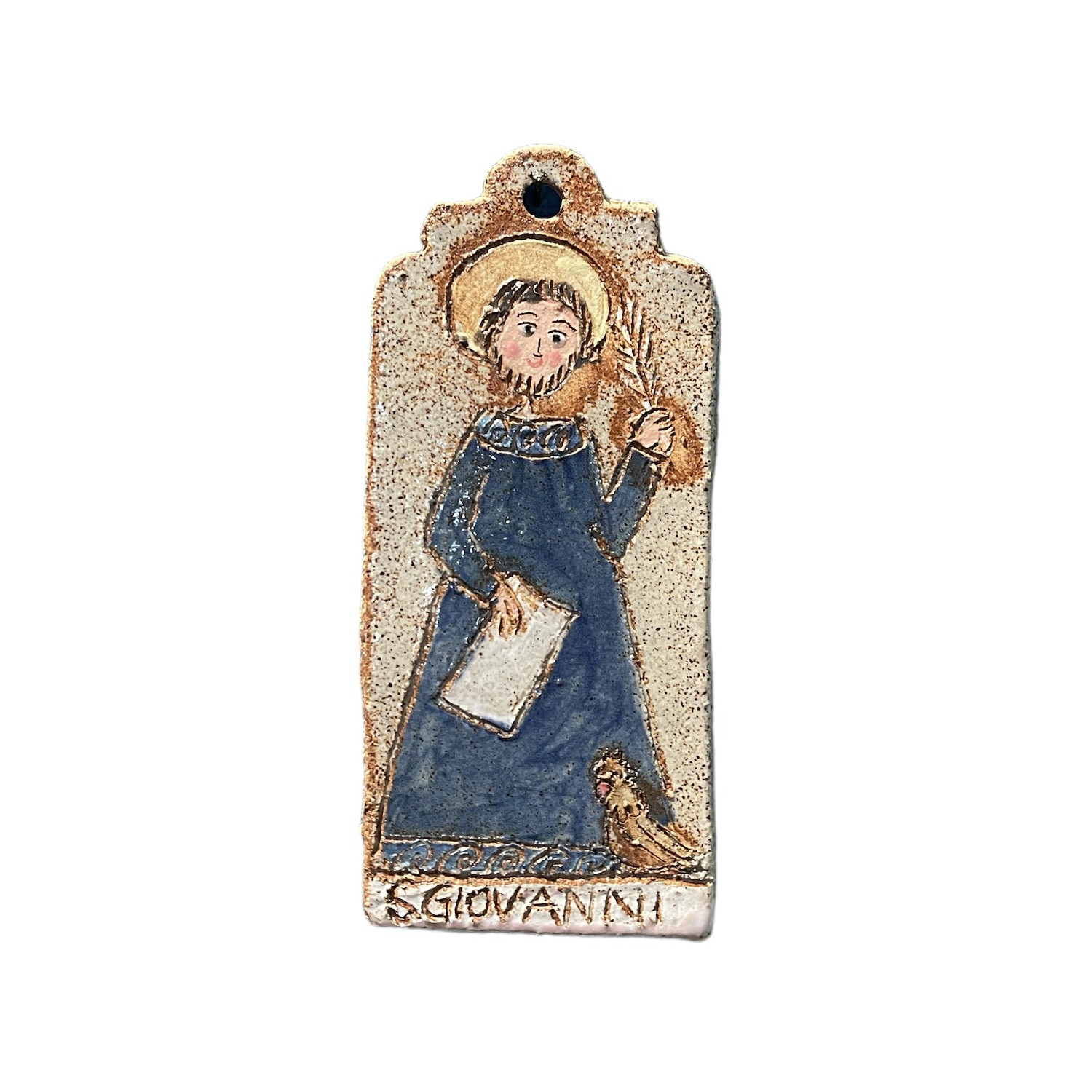 San Giovanni apostolo Santino in grès fatto a mano, design esclusivo della nostra ceramista Tania. Da appendere.