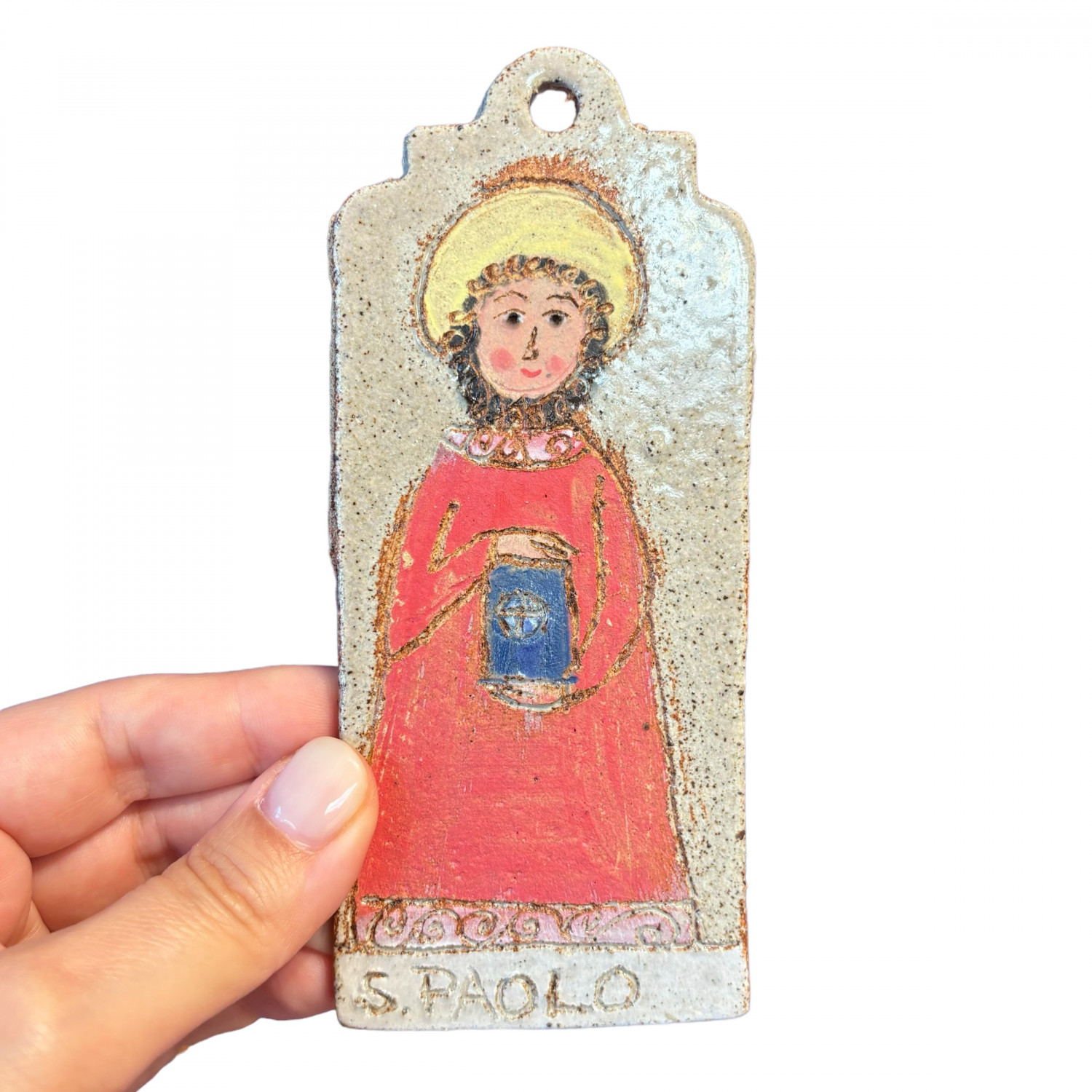 Santino in grès fatto a mano raffigurante San Paolo. Questo San Paolo è prodotto e disegnato dalla nostra ceramista Tania, si appende a parete con un semplice chiodo. E' una bellissima idea regalo per battesimi, occasioni speciali per bimbi, giovani e adulti. San Paolo è patrono insieme a San Pietro della città di Roma, della Grecia e di Malta; San Paolo è inoltre il Santo protettore di vescovi, giornalisti, cordai e dei missionari.