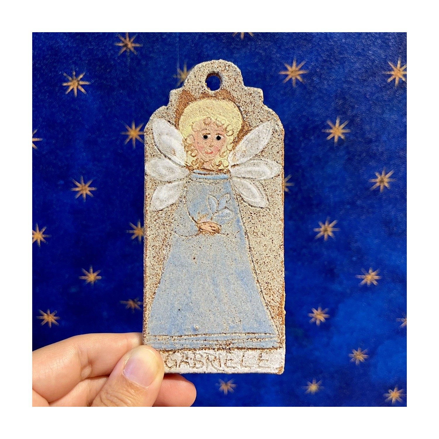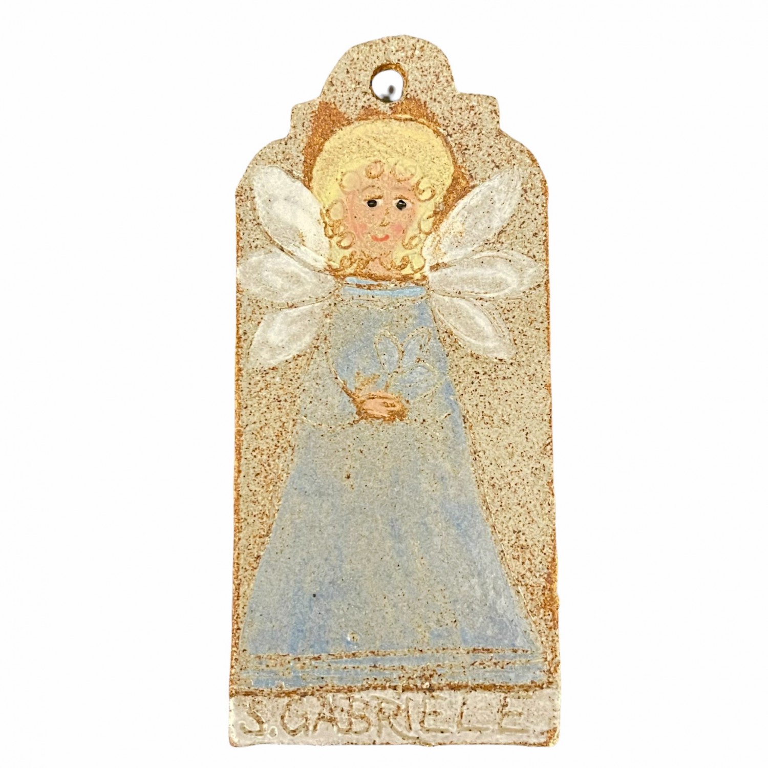 Piccolo pannello da appendere in grès fatto a mano raffigurante San Gabriele. Design esclusivo della nostra ceramista Tania; Tania, da oltre 20 anni crea per noi oggetti speciali fatti a mano con il suo stile unico. Ogni creazione è un pezzo unico, creato da Tania in esclusiva per la nostra bottega e per il nostro shop online; grazie al suo stile inconfondibile e alla sua sensibilità, queste opere incontrano sempre di più il gradimento dei nostri affezionati clienti. San Gabriele è protettore di: ambasciatori, comunicazioni, corrieri, giornalai, postini, radioamatori.