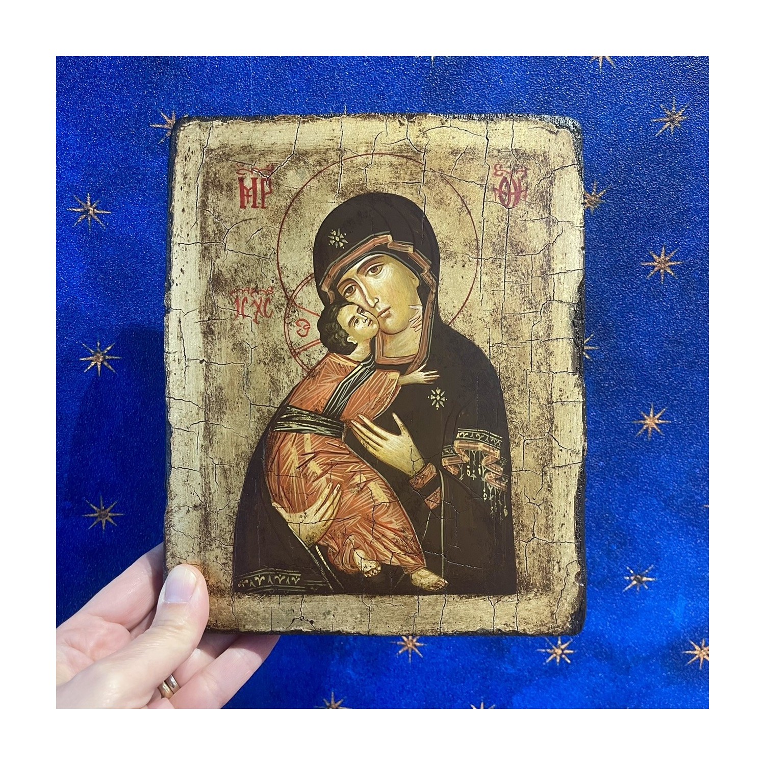 Icona nostra signora di Vladimir, dipinta a mano da laboratori di antica tradizione della scuola rumena. L'icona è stata scritta rispettando tutti i canoni. Dipinta a mano su tavola di legno ricoperta di lino e gesso, usando tempera naturale e foglia d'oro. Ogni pezzo è unico e irripetibile.