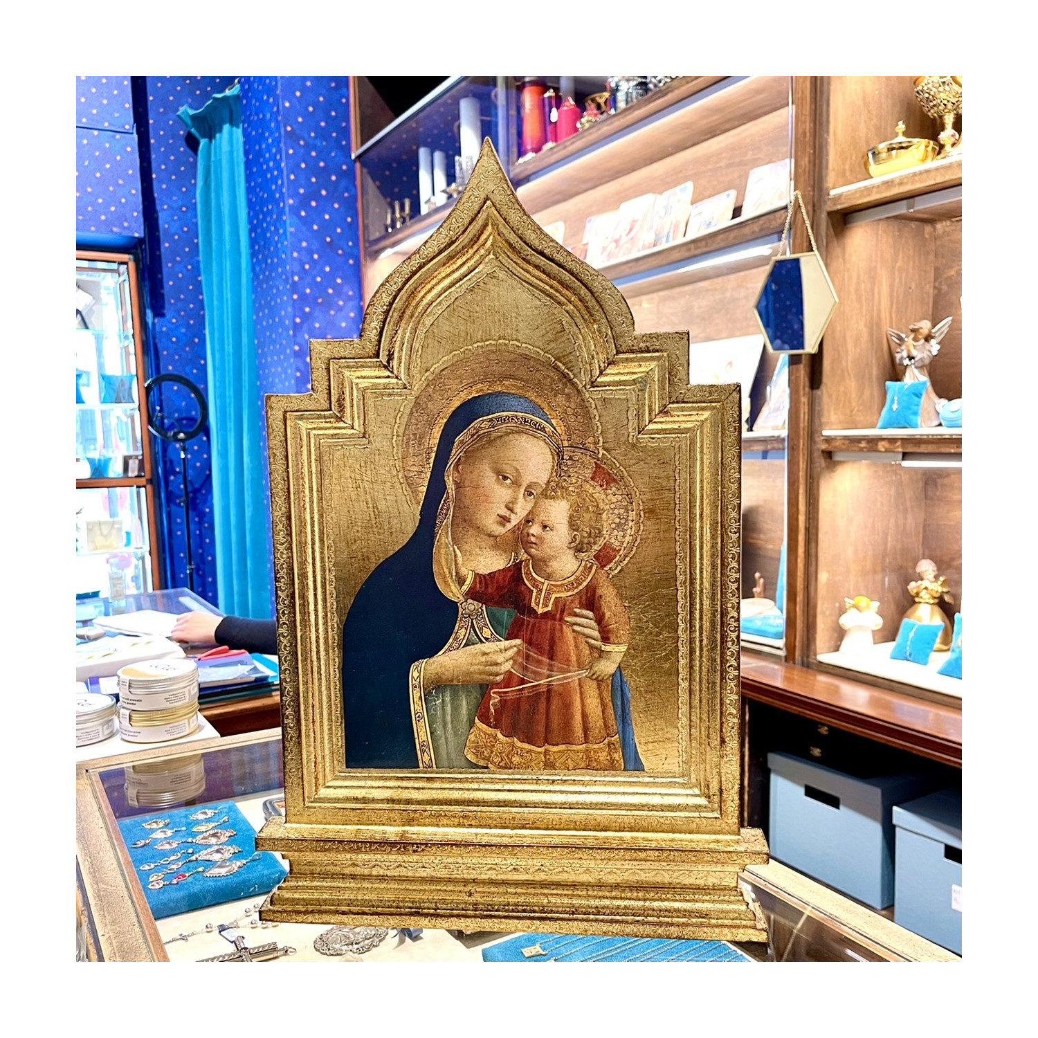 Tavola in legno con immagine riportata e fondo in foglia oro.