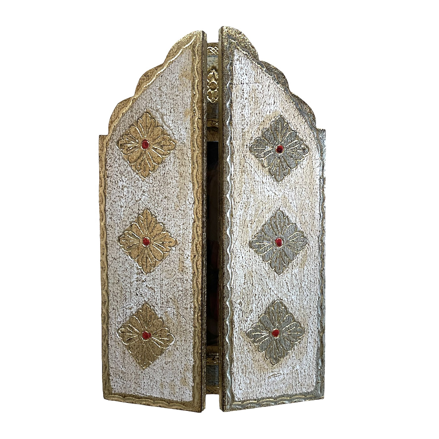 Trittico in legno con immagine riportata e fondo in foglia oro.