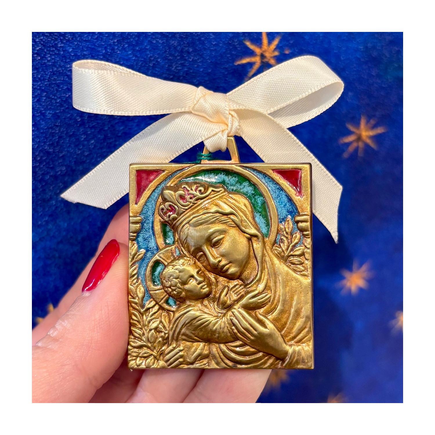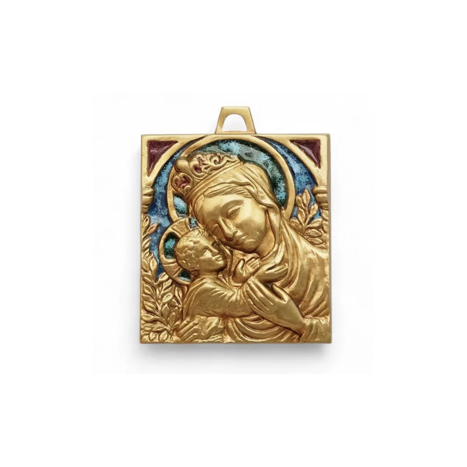 Placca Madonna con bambino in bronzo smaltato.
