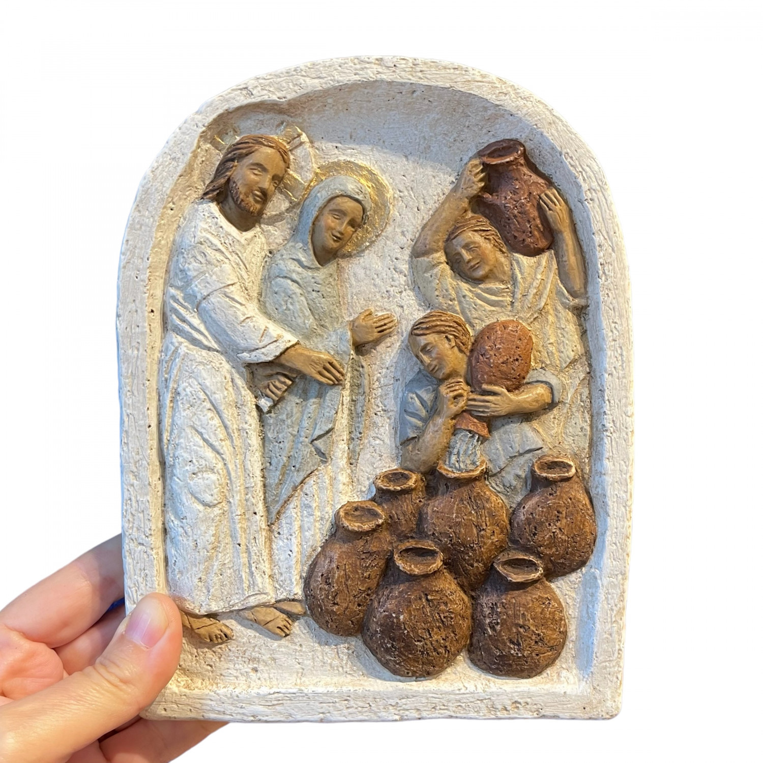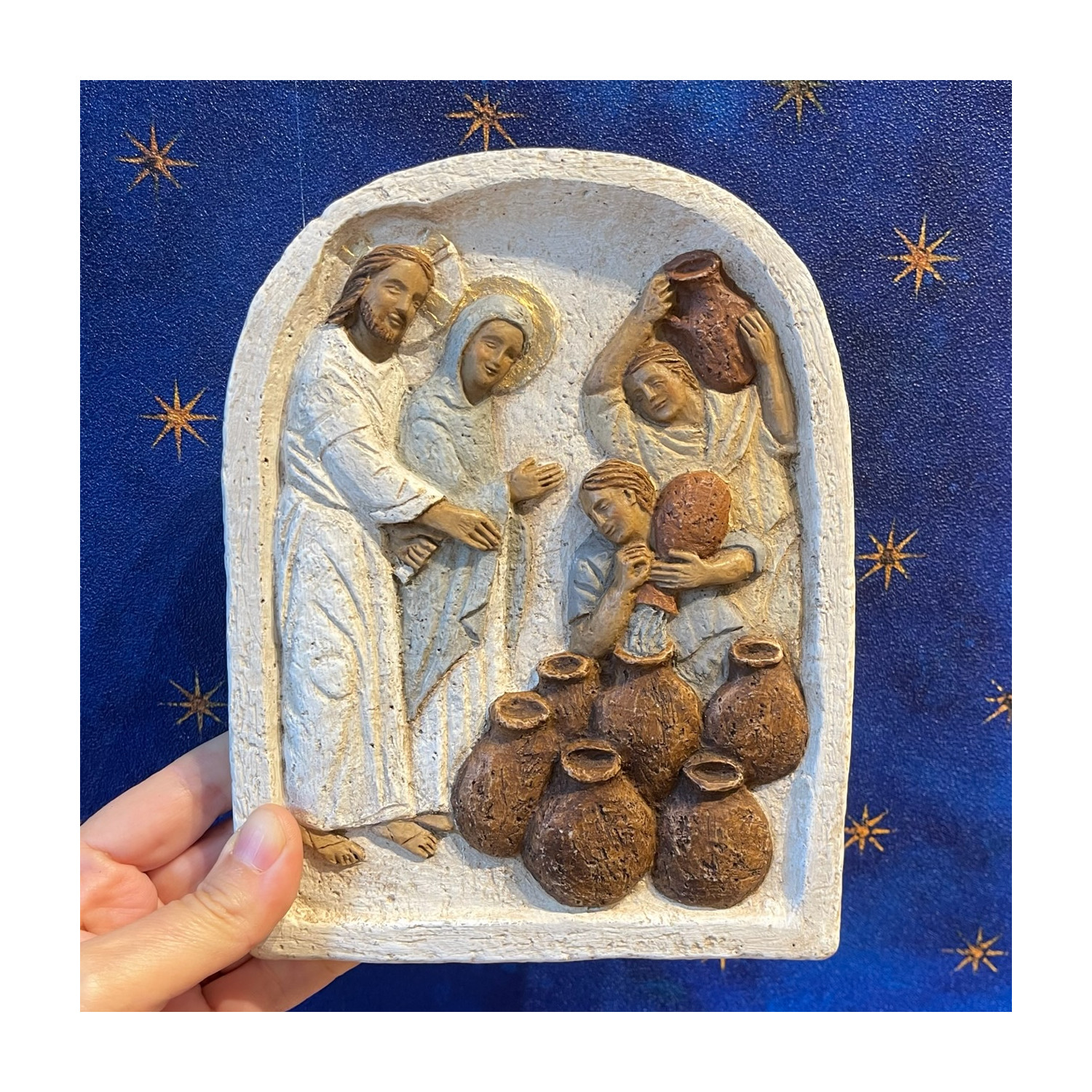 Pannello bassorilievo in pietra granitica dei pirenei, nozze di Cana.