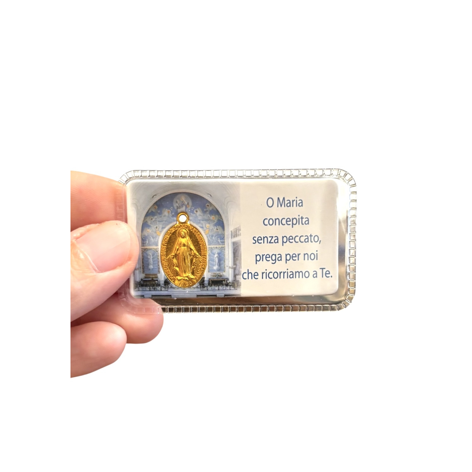 Card plastificata con medaglia miracolosa, completa di orazione e citazione, originale dalla Cappella della Medaglia Miracolosa di Parigi.