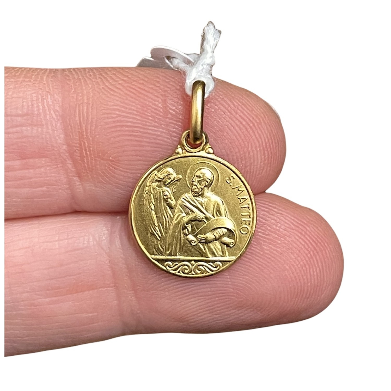 Medaglia in oro 18 carati San Matteo. Diametro 14 mm peso gr 2,24. Questa medaglia è fatta a mano con lavorazione a conio. E' possibile personalizzare la medaglia con un'incisione sul retro. Siamo lieti di omaggiare la personalizzazione per questa medaglia. Altre misure disponibili sia richiesta.
