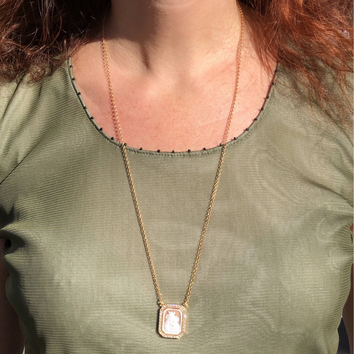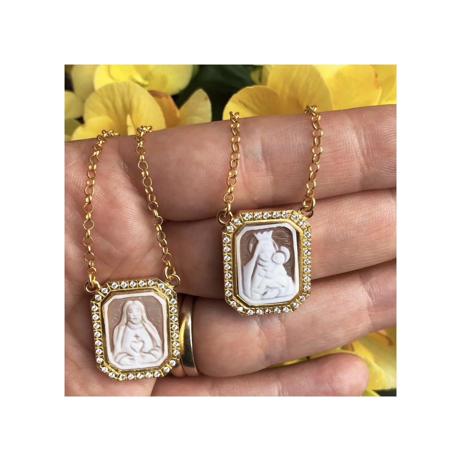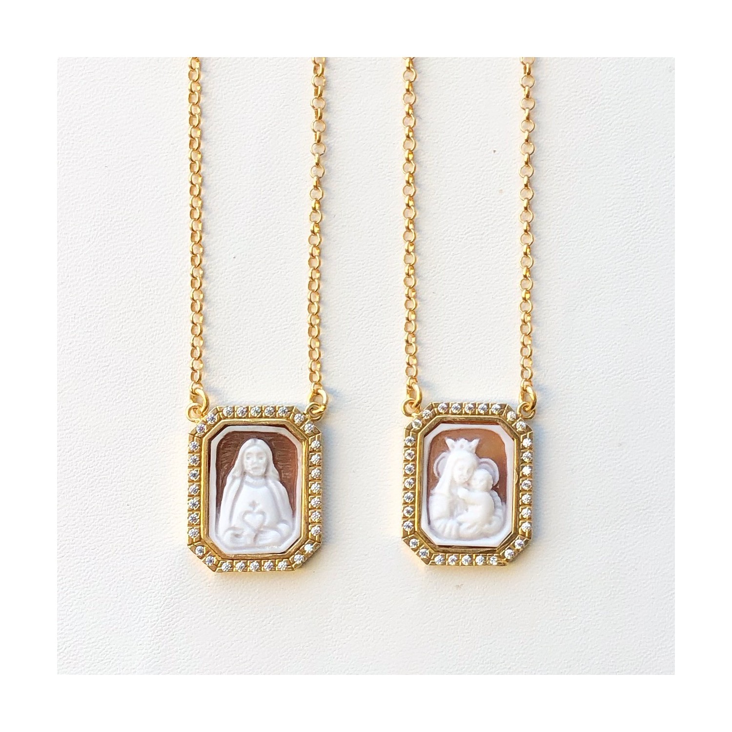 Collana scapolare in argento 925 dorato, con due medaglie con cammeo e zirconi incassati da portare una sul petto e una sulla schiena; in segno di protezione e devozione Mariana. Lunghezza catena cm 66, medaglie mm 18X25.
