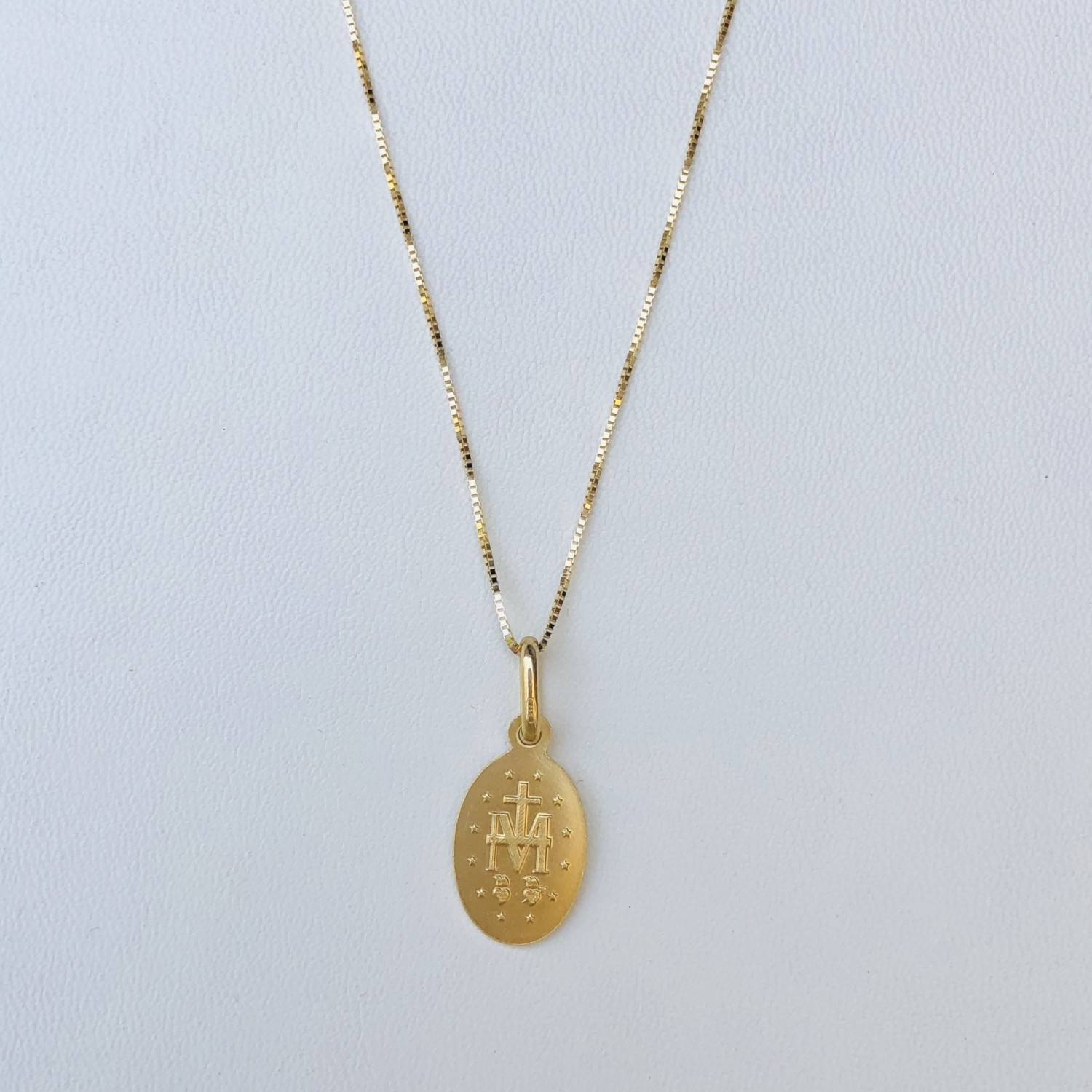 Medaglia Miracolosa in oro 18K misura medio/piccola ovale mm 12 X 9, peso gr 1,40. Catenina maglia veneziana, cm 40 peso 1 gr.