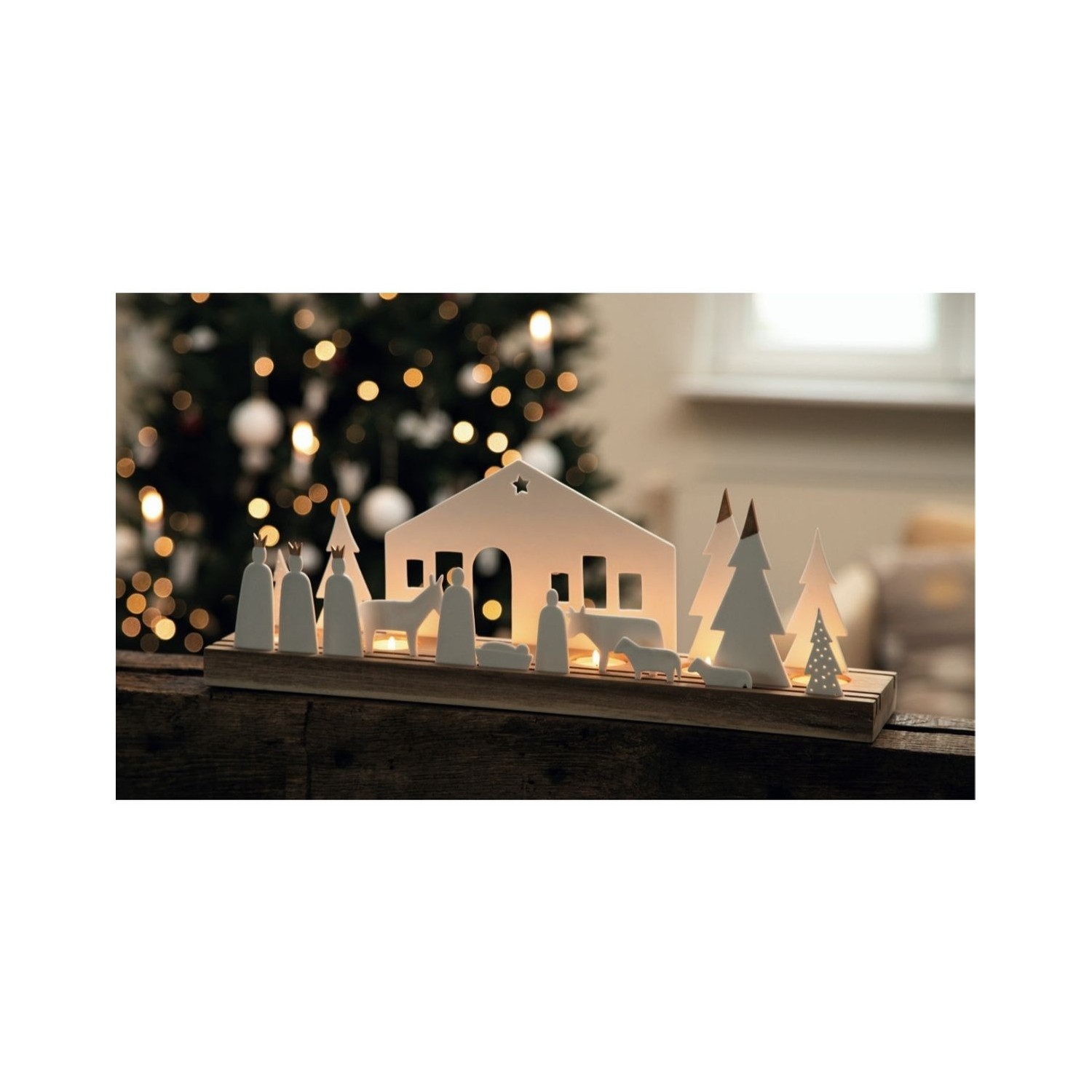 presepe di design in ceramica e legno.