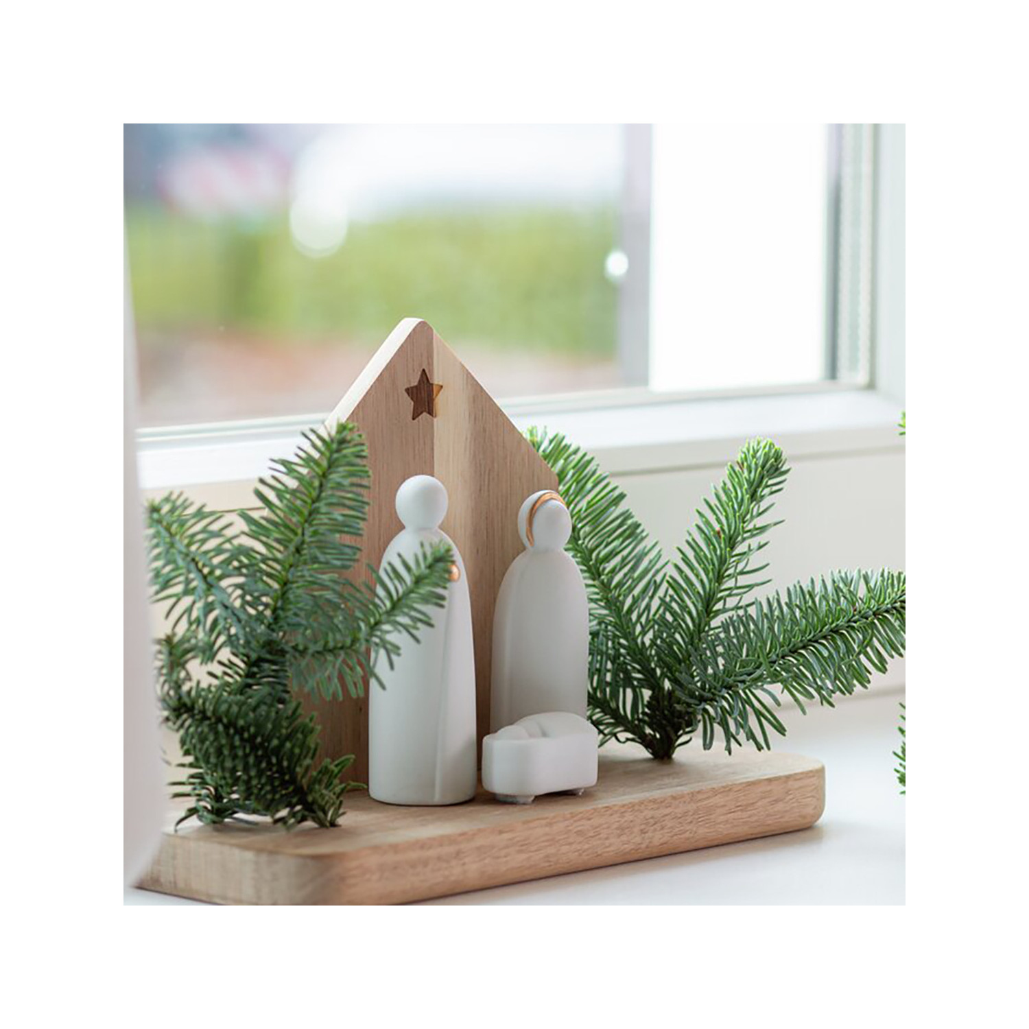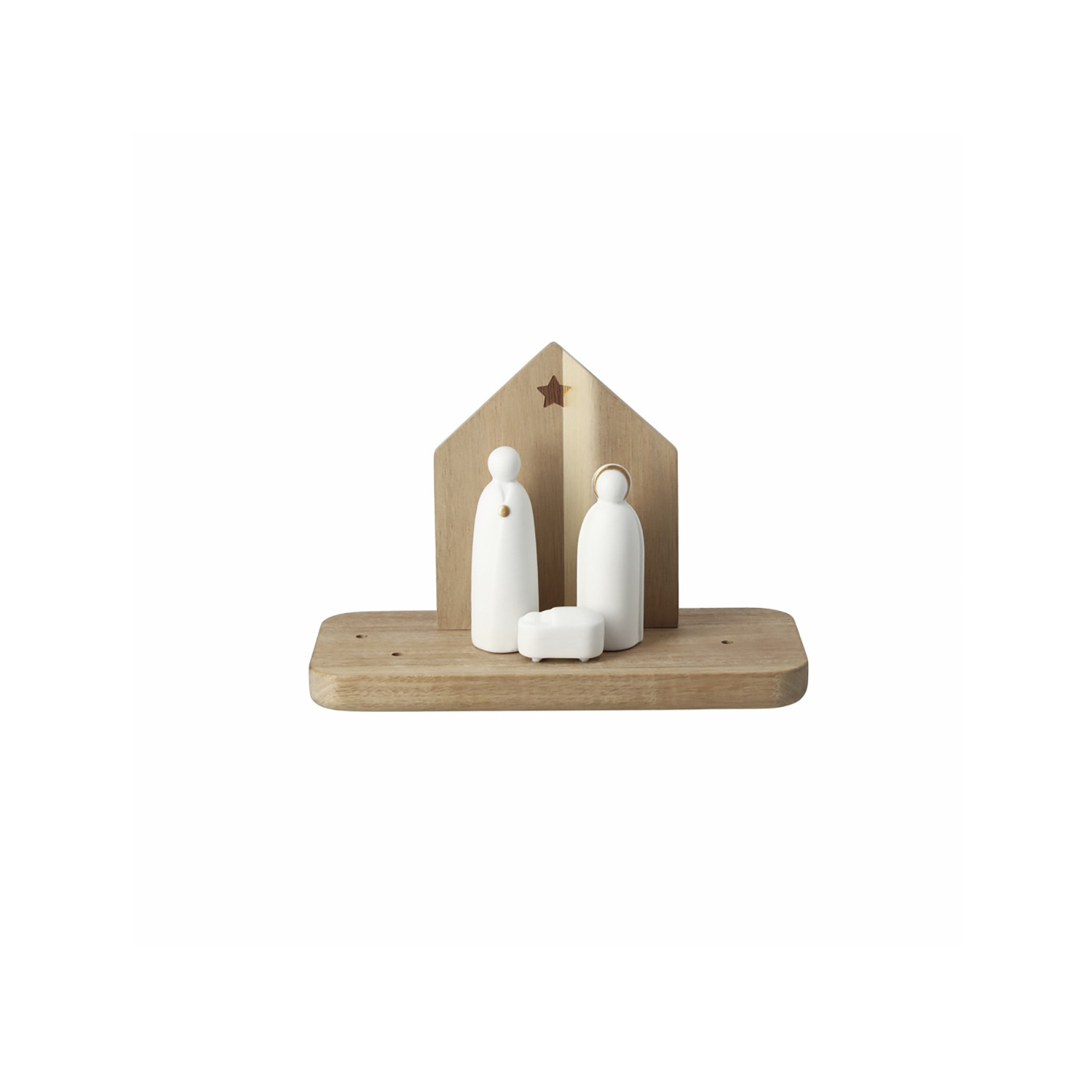 Presepe in ceramica con appoggio in legno