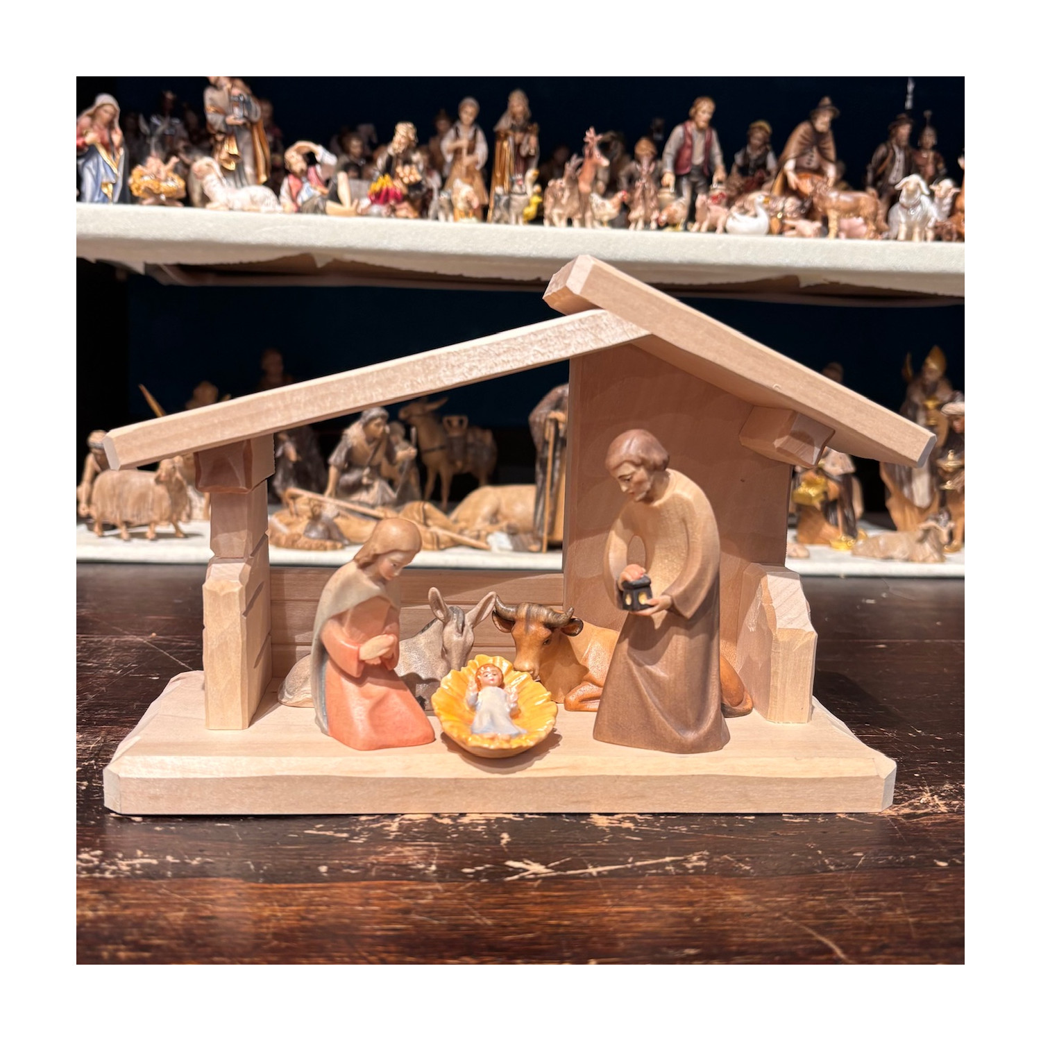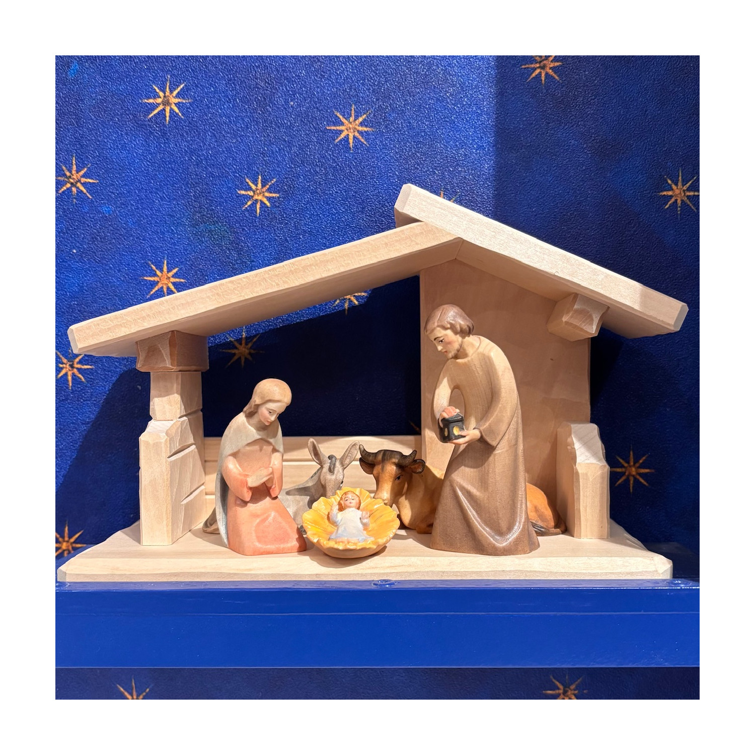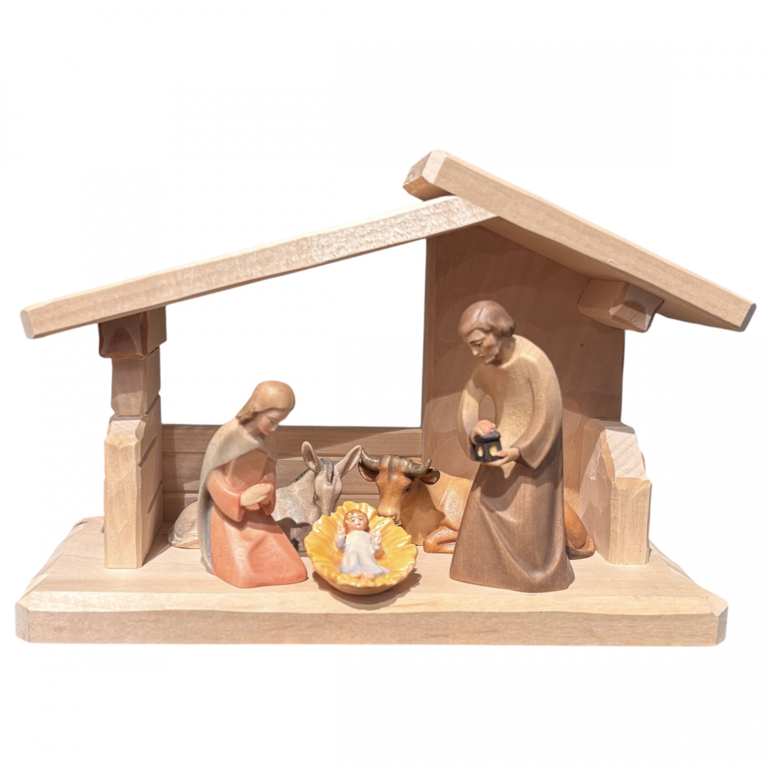 Presepe in legno di acero dipinto con colori ad olio, natività con asino e bue scala cm 9, misura capanna cm 22X15X10. Prodotto artigianale fatto in Val Gardena dal maestro scultore Leo. Sono disponibili tutti i pezzi della stessa collezione per arricchire il presepe (Re Magi, pastori, personaggi, animali piccoli e grandi)