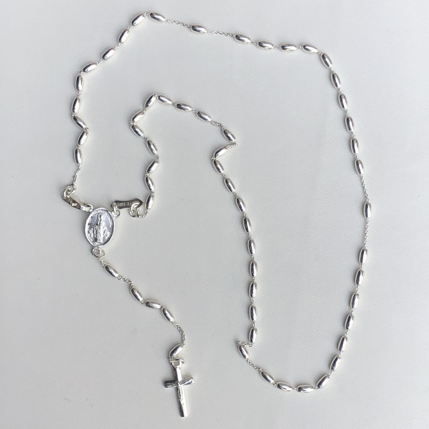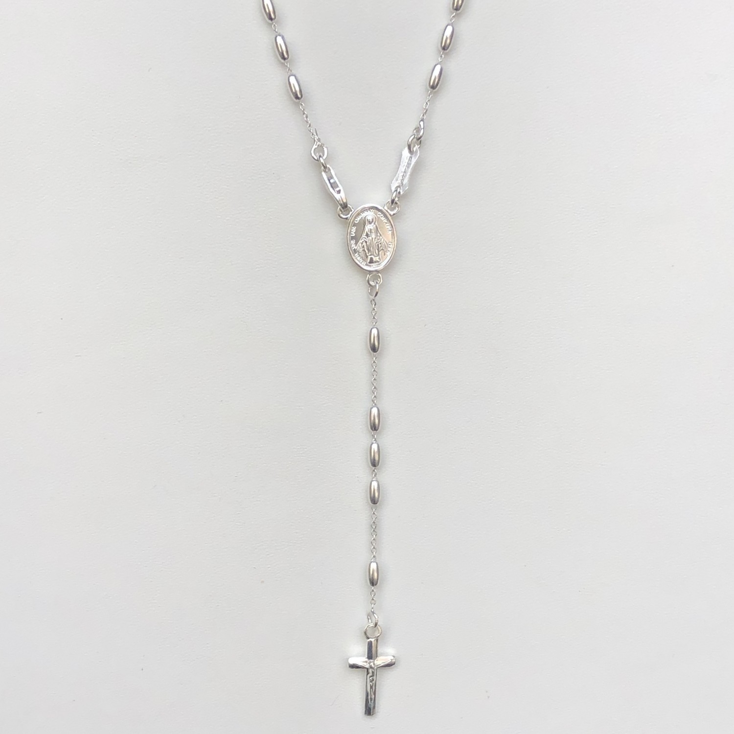 Rosario in argento 925 con moschettone , grano ovale mm 5. La chiusura è posta vicino alla crocera, così che il rosario può essere indossato e utilizzato per la preghiera, senza che il gancio "disturbi" la catena. Il Santo Rosario, la preghiera più diffusa che la tradizione popolare ci abbia consegnato, ha consacrato nei secoli l’aspetto più umile della vita della Madonna. Recitandolo, è come se la figura di Maria si imponesse nel suo aspetto più semplice e più nascosto."-Luigi Giussani"