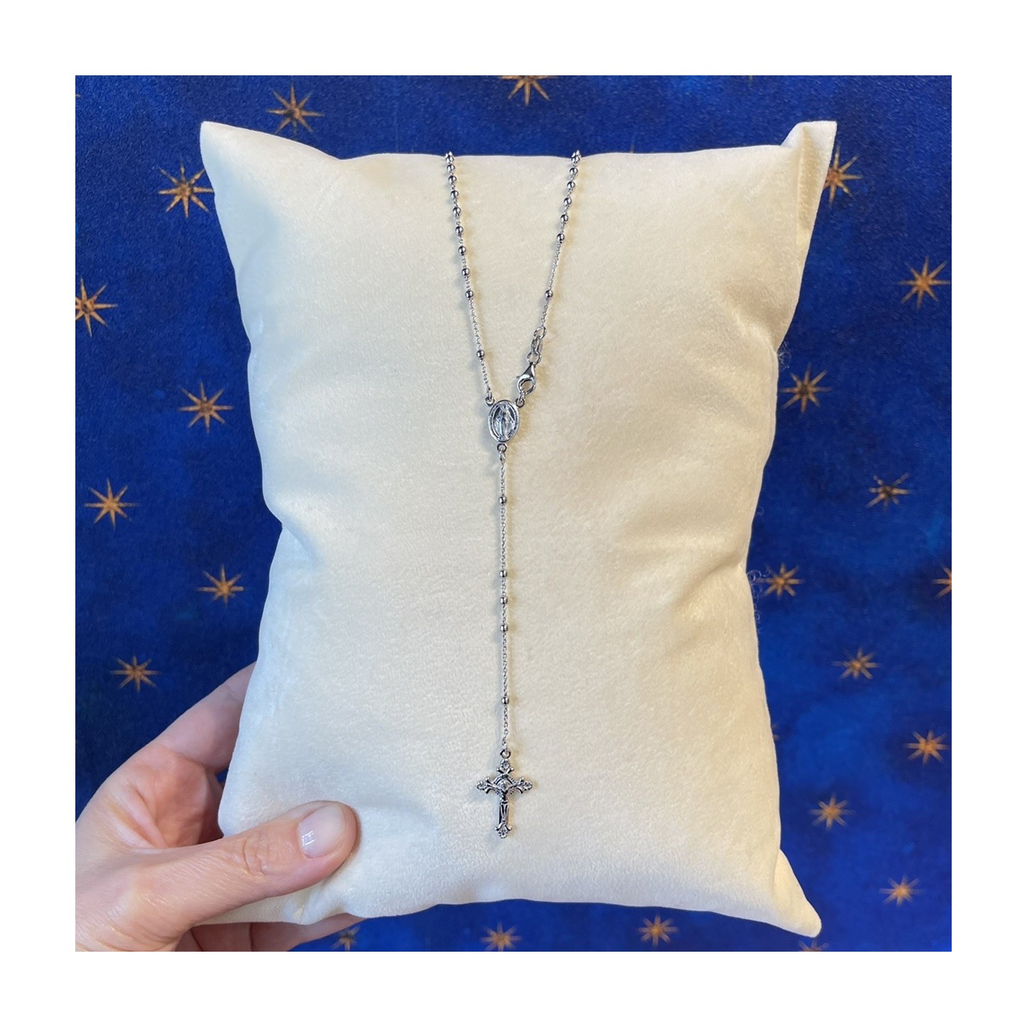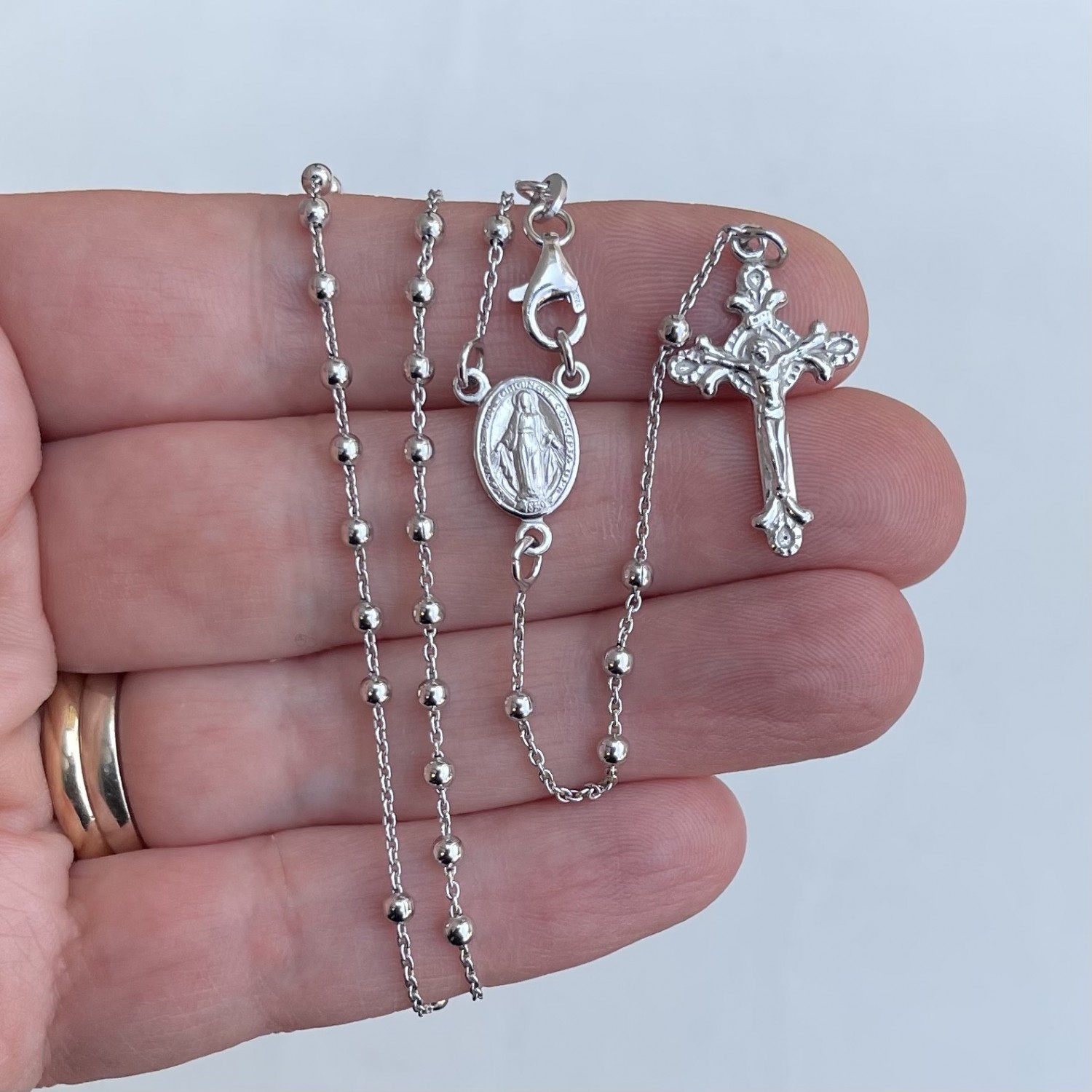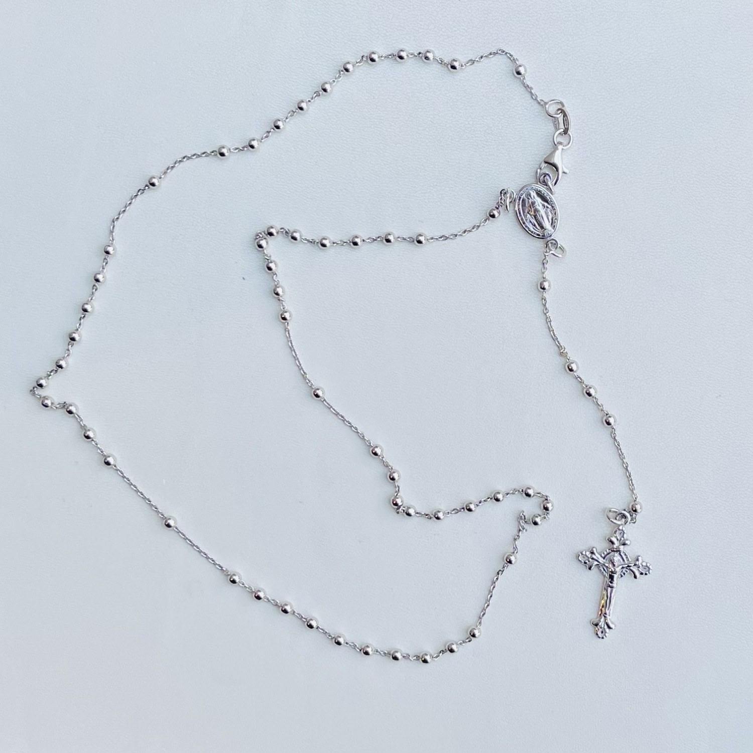 Catena Rosario in argento 925 rodiato, il rosario può essere utilizzato per la preghiera e indossato. Il gancio è posizionato vicino alla crocera in modo da non interrompere a catena. Crocera medaglia miracolosa, croce lavorata. Grani mm 2, lunghezza parte girocollo cm 48, parte pendente cm 11,5.