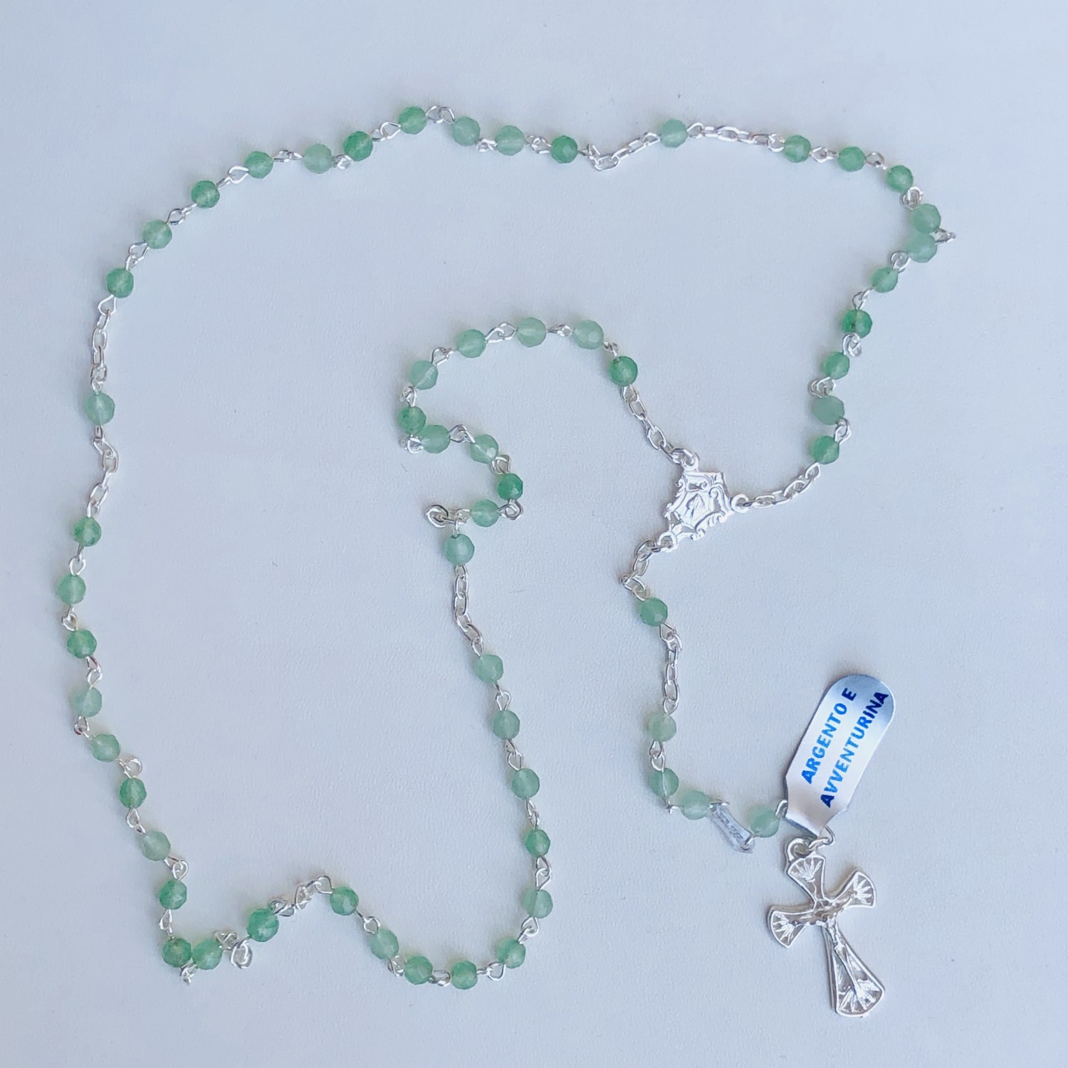 Rosario in argento 925 e avventurina sfaccettata, grano mm 4. Questo rosario è adatto per pregare; può essere anche indossato verificando che la lunghezza complessiva della parte lineare di cm 57 sia sufficientemente ampia per passare dalla vostra testa (in caso contrario basta chiedere la modifica nel campo "note". L'avventurina è una pietra della famiglia dei quarzi, aiuta a crescere, a evolversi; è quindi la pietra consigliata per i ragazzi e gli adolescenti o per chi vive un momento di svolta o di cambiamento; ha, inoltre, proprietà anti infiammatorie.